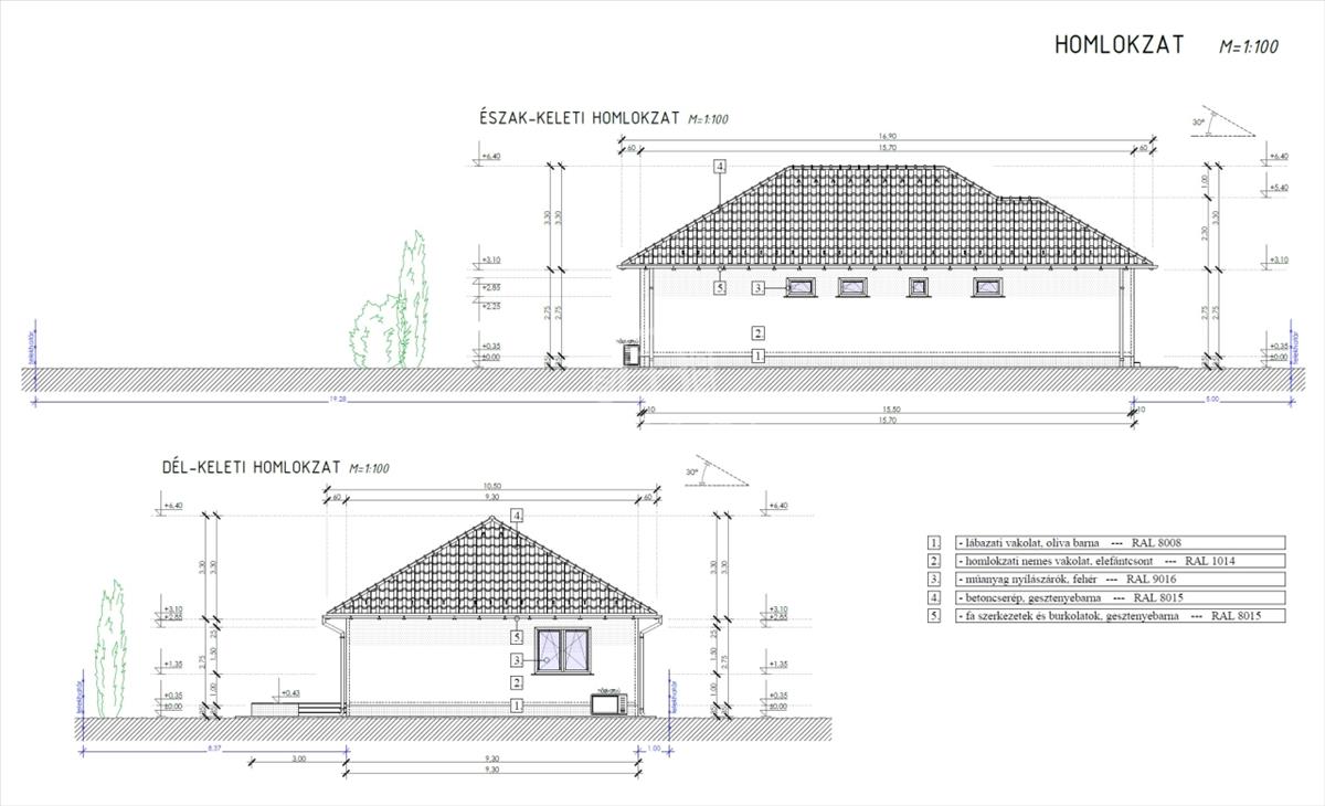 A tető héjazata antracit betoncserép lesz, a homlokzatok 15cm eps, a padló 10cm Austrotherm AT-N100-as, a vízszintes födém 25cm Ásványgyapot szigeteléssel lesz ellátva.