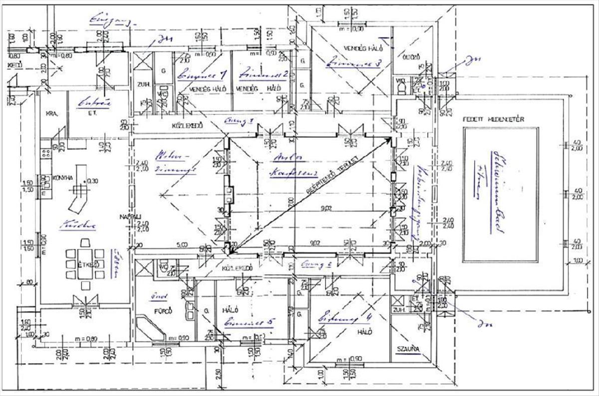 1. Egy földszintes, 560 nm-es házban egy tágas konyha-étkező (a nyári időszakban az étkezőből közvetlenül ki lehet ülni a nagy méretű teraszra, ha esetleg panzióként működne ez a több hálószobás épület, de privát családi vagy baráti összejövetelekhez is kiváló lehetőség), nappali szép kandallóval, 5 darab nagyon jó állapotú, hasonló méretű, bútorozott hálószoba és négy fürdőszoba (1 fürdőszoba/zuhanyzó/WC és 3 zuhanyzó/WC) is található, továbbá egy fedett edzőterem medencével és szaunával.