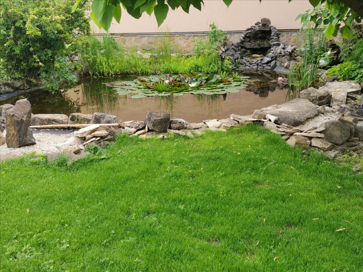 A kert egy igazi oázis: halastó, sziklakert, termő gyümölcsös és kútvízről táplált öntözési lehetőség várja. a gépjárművek tárolására viacoloros bejáró és 2-3 autó számára alkalmas fedett beálló szolgál, egy kis műhellyel kiegészítve.