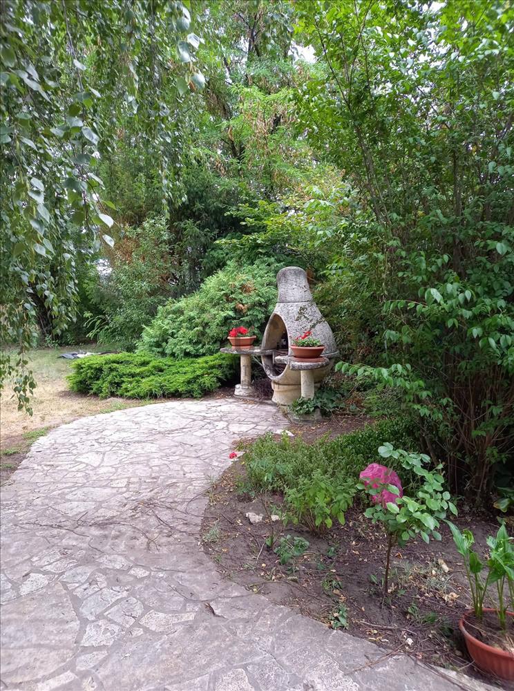 A kertben egy kis tó került kialakításra, illetve egy grillező terasz.