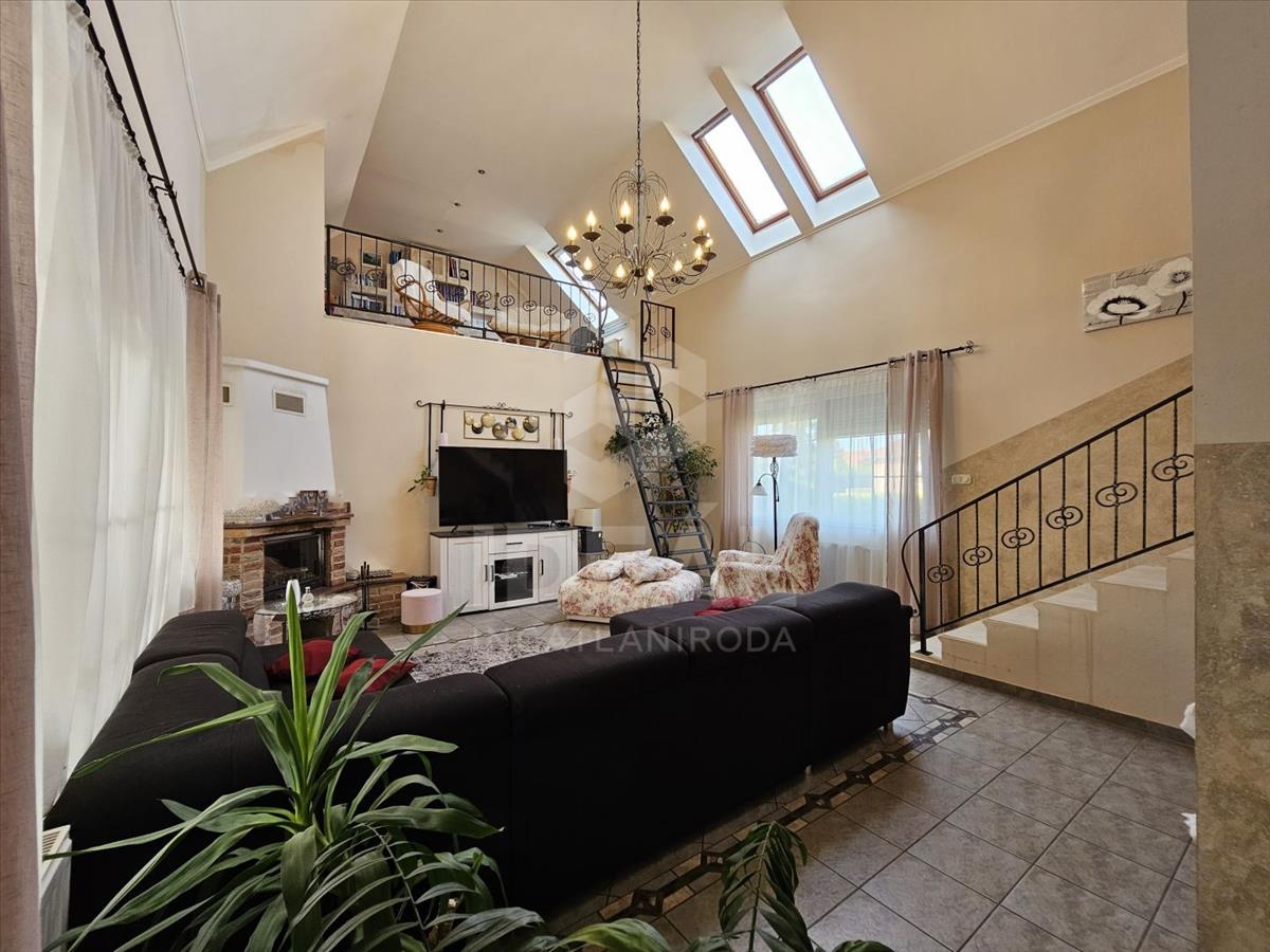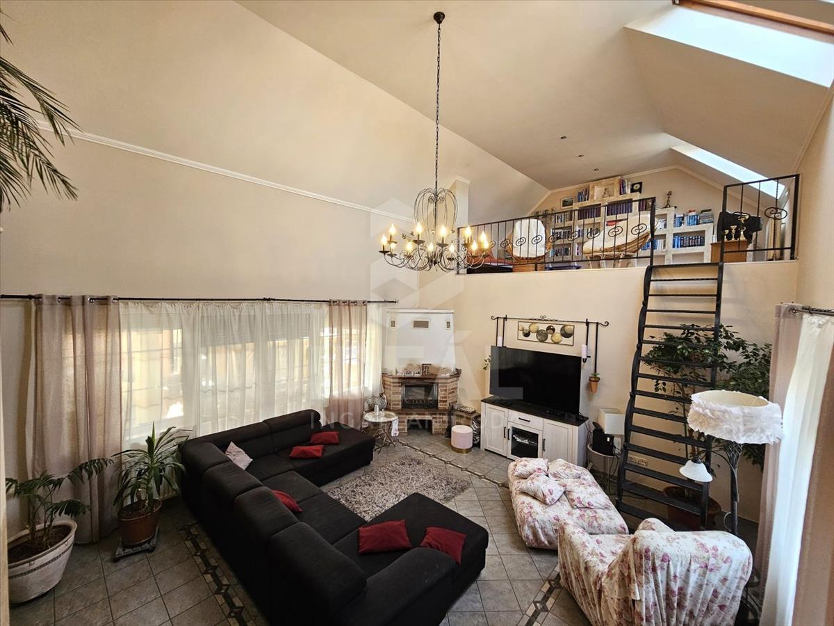 Innen belépve egy tágas ( 70 m2) napfénybe pompázó derűs hangulatú, amerikai konyhás nappali fogad bennünket, galériával és kandallóval.