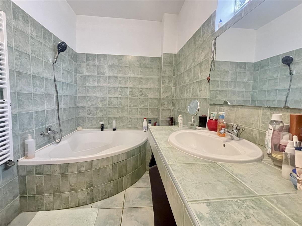 A földszinti fürdő zuhanyzóval és káddal is, az emeleti káddal felszerelt.