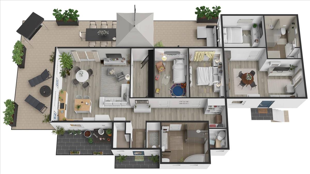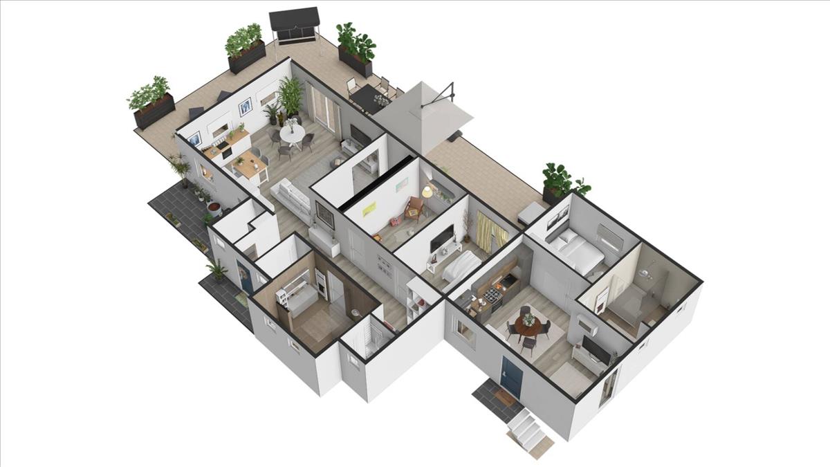 A 2021-ben épült, összesen 127 nm -es ingatlan két különálló lakrészből áll: egy 91 nm -es nagyházból és egy 36 nm -es kisházból.