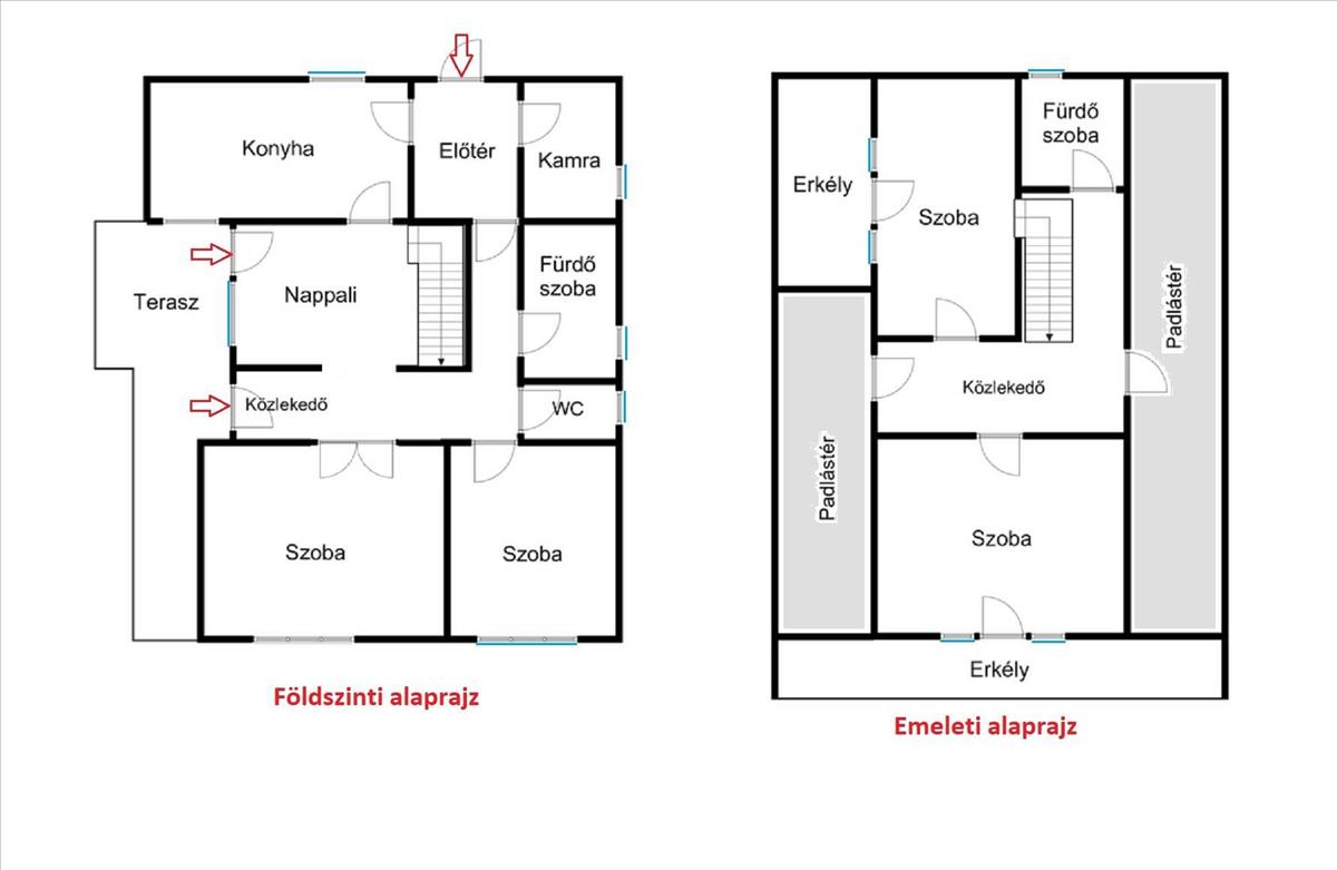 Az emeletre kényelmesen járható fa lépcső (nem nyikorog! ) Vezet fel, ahol szintén két hálószoba található, mindkettő saját erkéllyel, tusolós és wc-s fürdőszoba, illetve 2 oldalt padlástéri tárolók vannak. Lakóterülete ~50 nm.