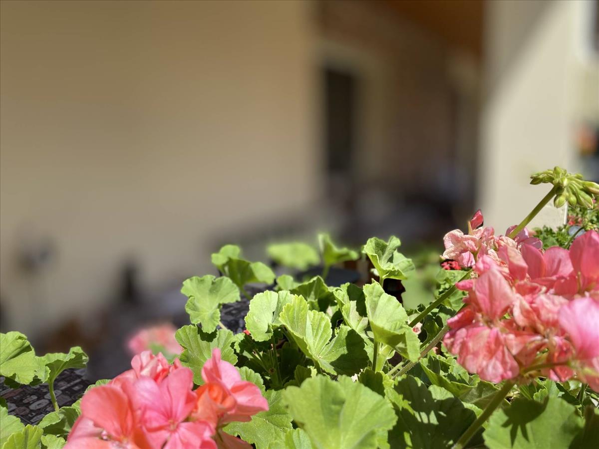 Az udvar gondosan karbantartott, füvesített, dísznövényekkel, termő fügével és fúrt kúttal.