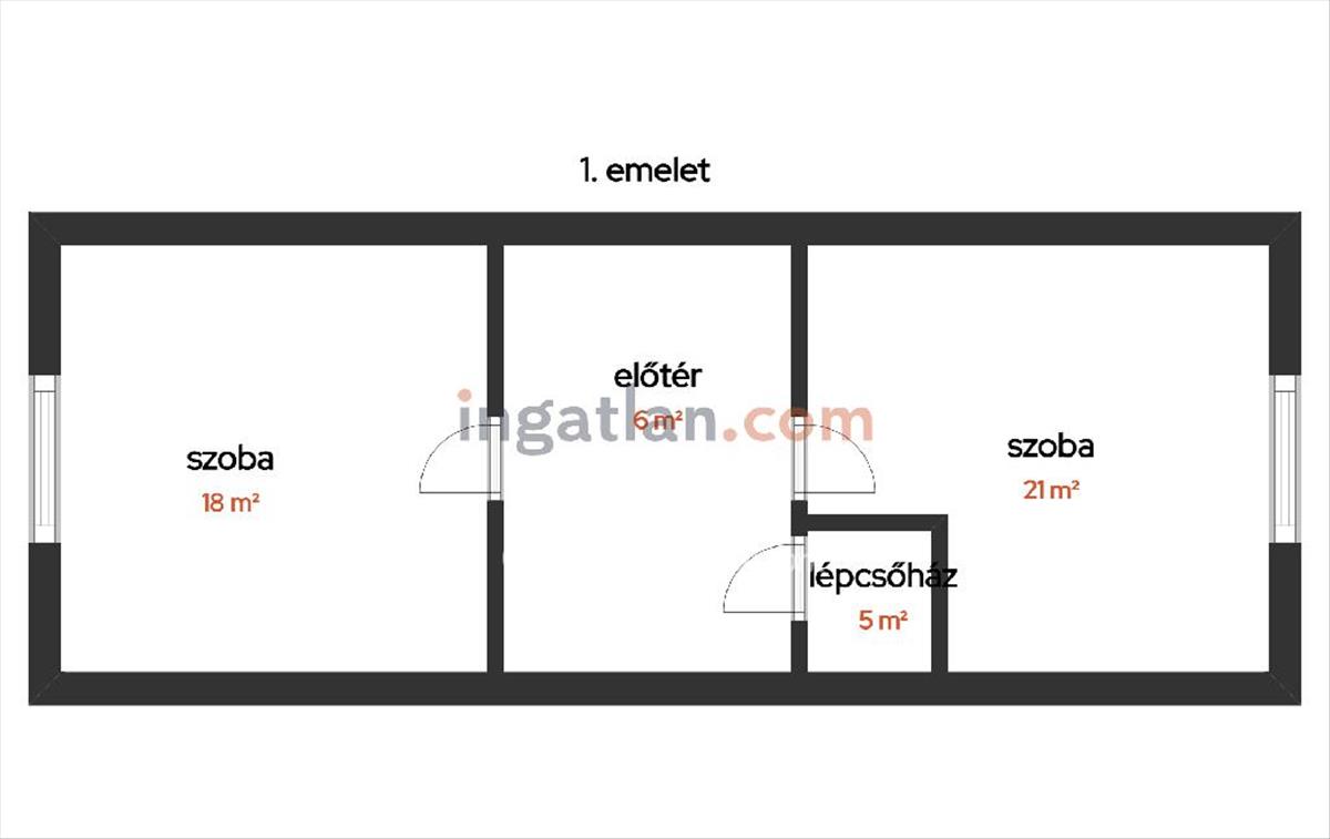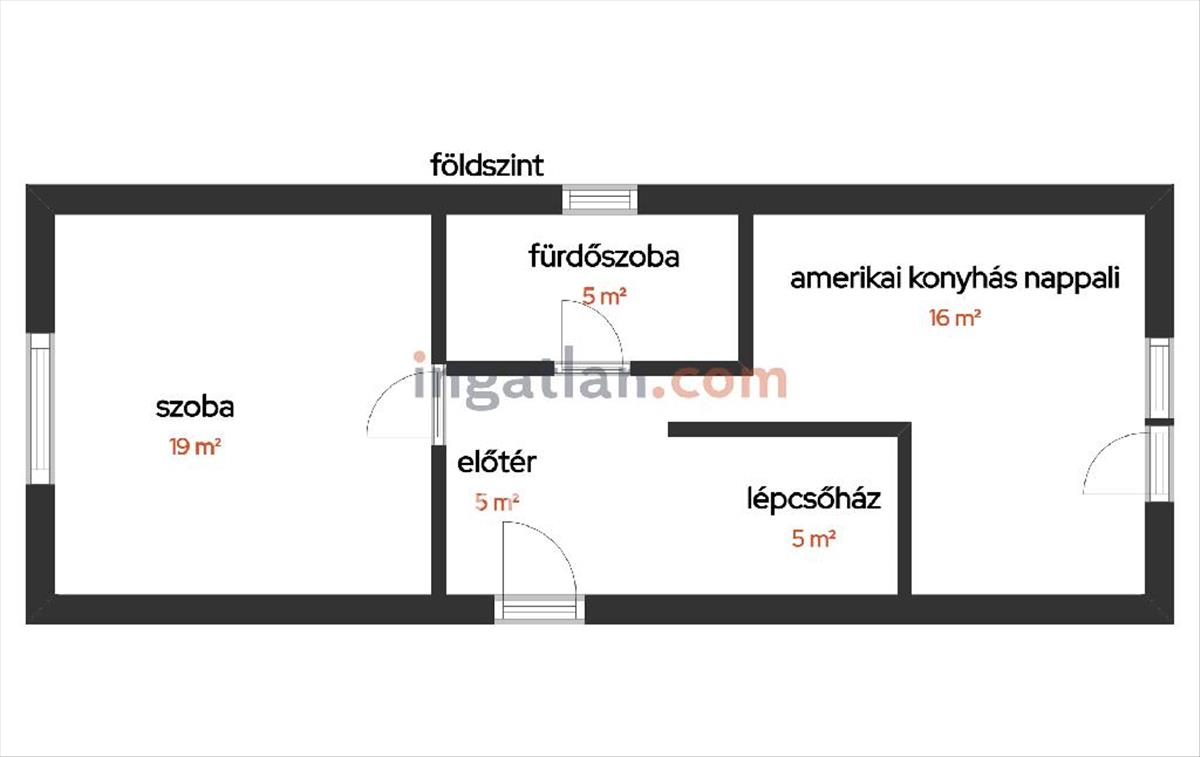 Helyiségek: földszint: amerikai konyhás nappali, szoba, fürdőszoba (WC-vel egyben), közlekedő, előszoba, lépcsőház.