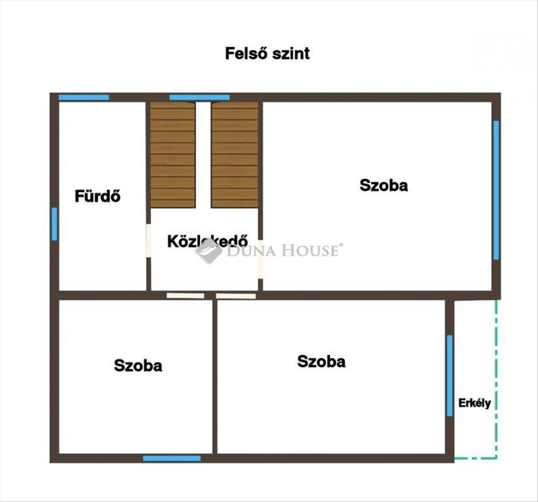 Az emeleten három nagyméretű, világos szoba kapott helyet, melyek közül az egyikhez erkély is kapcsolódik, továbbá egy fürdőszoba sarokkáddal. a tágas, jól tagolt terek kényelmes életteret biztosítanak egy nagyobb család számára is.