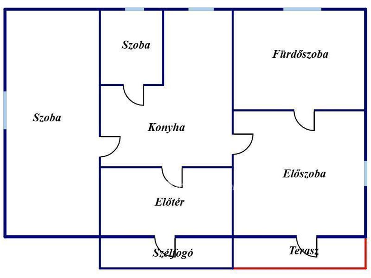 Egy nagyobb szoba, egy kisebb szoba, konyha, kamra, előszoba, fürdőszoba és előtér részekből áll.