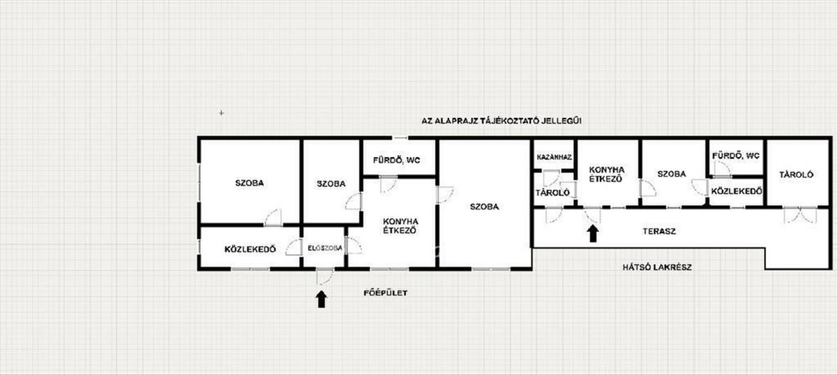 Az első házrész kb. 65 m2 alapterületű, 2, 5 szobával és tégla alapzatú, 60 cm vastag vályogfalazattal rendelkezik, míg a hátsó, téglaépítésű lakrész kb. 35 m2-es. Igény esetén a két épületrész egybenyitható, így könnyedén alakítható nagyobb család számára is.