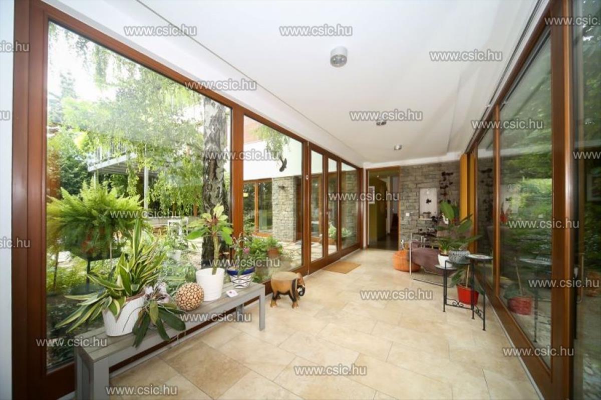 A házba belépve magával ragadja az embert a természet közelsége, ugyanis a felső lakrészbe egy mindkét oldalán hatalmas üvegfelületekkel, tolóajtóval kialakított folyosó-télikerten keresztül jutunk. a világos, tágas nappali-étkező-konyhában ugyancsak úgy érezhetjük magunkat, mintha a kertben lennénk. a kertkapcsolat itt is biztosított, és a családi étkezéseknek, pihenésnek egy igényesen kialakított fedett terasz biztosít helyet. a modern megjelenésű kerti csobogó nyugalmat áraszt, kellemes hűsölést biztosít a forró napokon is. Ezen a szinten található még egy kamra és egy vendég wc is.
