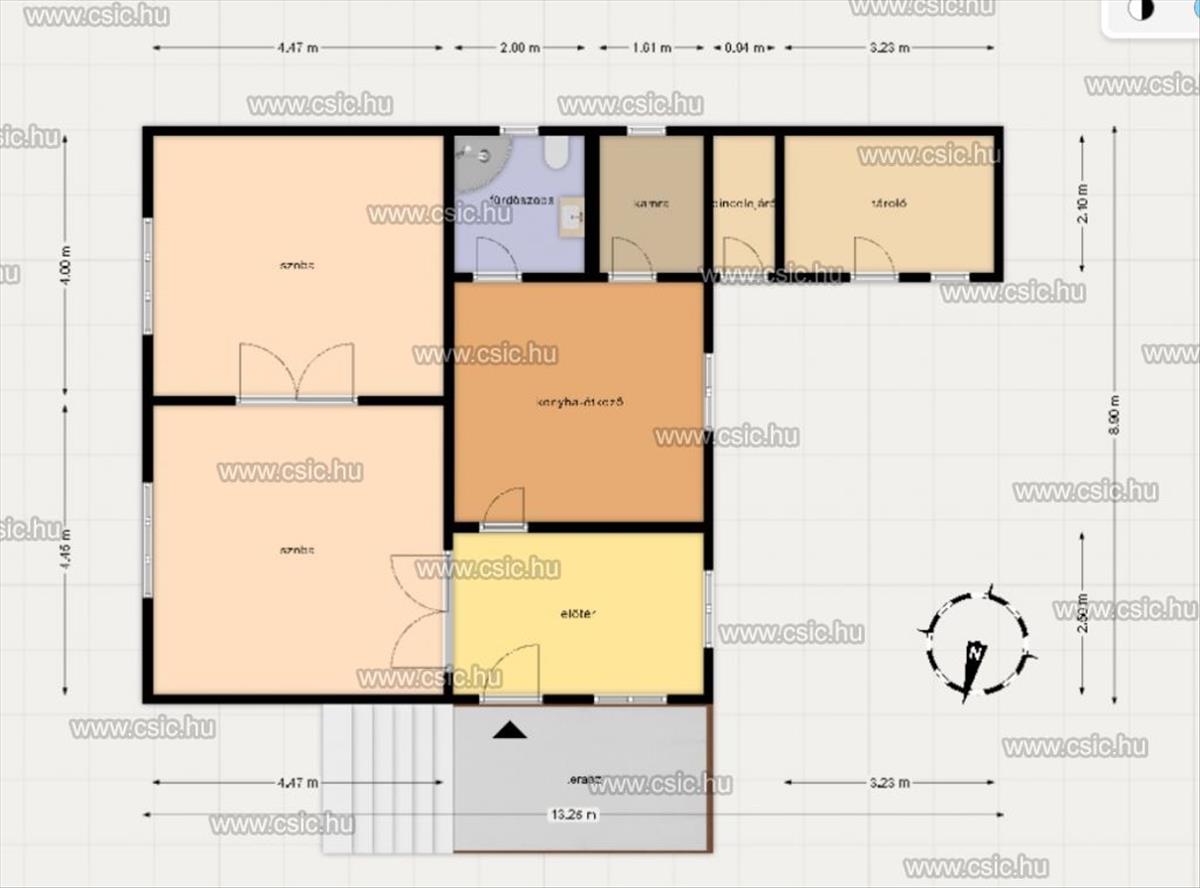 • 100 m2 alapterület: 2 egymásból nyíló szoba + étkező-konyha + fürdőszoba + kamra + előtér + terasz