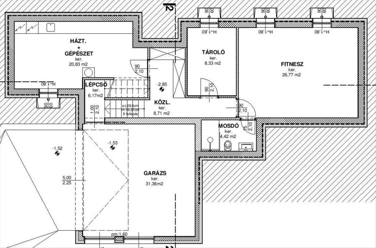Pinceszint:, garázs 2 autónak, mosdó, gépészeti helyiség, tároló, fitness szoba.