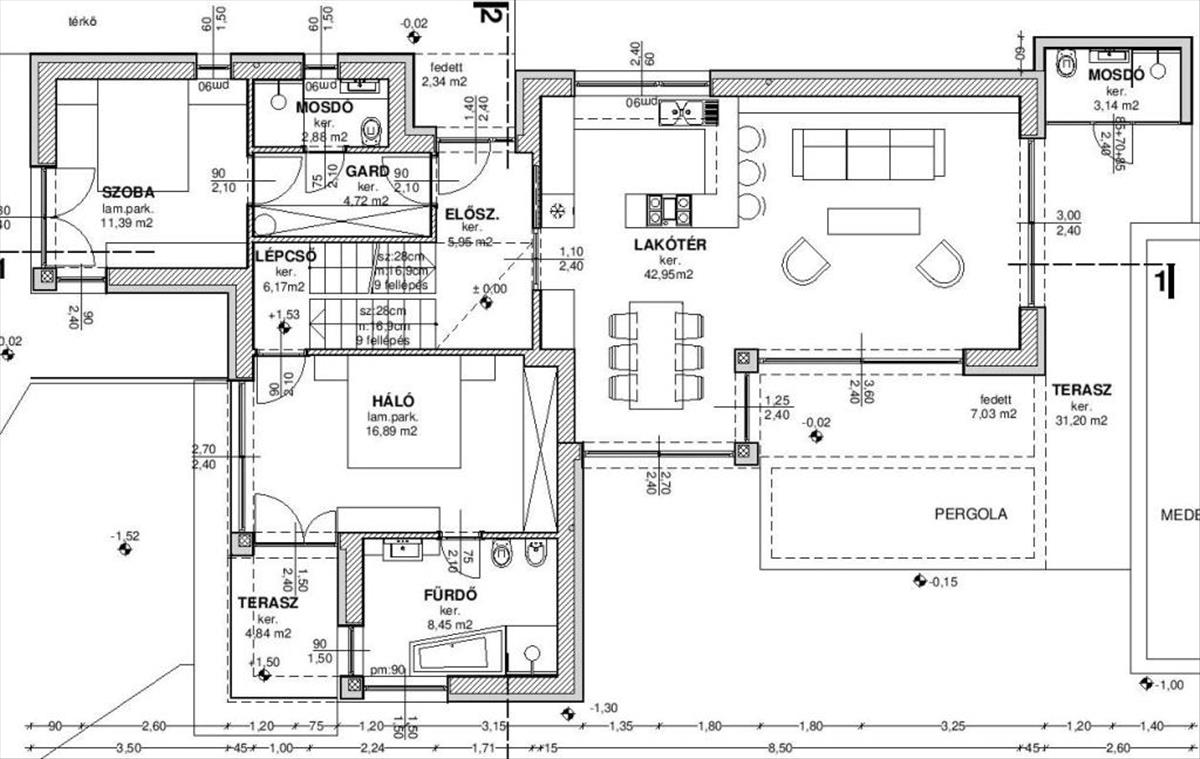 Földszint: Amerikai konyhás nappali, 31. 2Nm-s terasszal, hálószoba, gardrób fürdőszoba, 2 mosdó.
