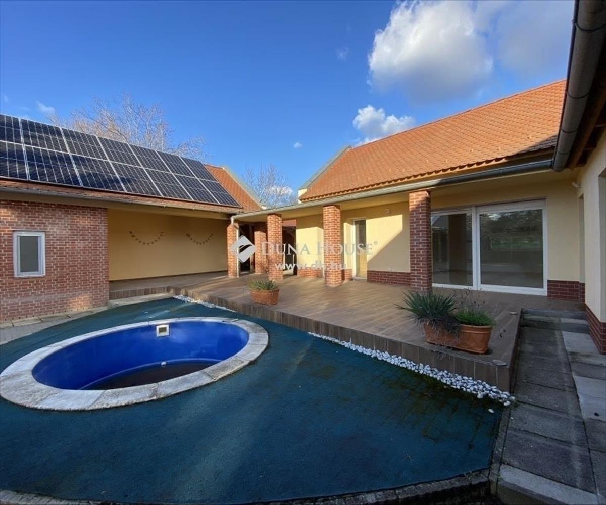 Nagykozárban, Pécstől 10 percre, eladó egy 150nm alapterületű, amerikai konyha nappalis, 4 hálószobás, 3 fürdőszobás, nagy teraszos, modern kialakítású, egyszintes családi ház, 3 állásos garázzsal, fedett autóbeállóval, 2739nm-es területtel. Az ingatlan U alakban körbe öleli a mediterrán teraszt és a medencét, ezzel teljes intimitást biztosítva. a ház déli fekvése és nagy méretű nyílászáróinak köszönhetően rendkívül világos. a tágas nappaliból és az étkezőből közvetlen kijárat nyílik a mediterrán teraszra és a medencéhez. a 4 külön nyíló hálószoba közül az egyik saját fürdőszobával rendelkezik. a ház elrendezése nagyon átgondolt, mivel a hálószobák teljesen elkülönülnek a közös terektől, ezzel nem zavarva a pihenni vágyókat. Az ingatlanban gardrób és háztartási helyiség is helyet kapott. Az udvarban található egy 3 állásos garázs, elektromos kapuval, elektromos autó töltővel, továbbá egy fedett 3 állásos autóbeálló. a garázsból további háztartási helyiségek nyílnak, melyek fűthetők és mosdóval felszereltek. a terület szépen gondozott, térkővel burkolt. Extrák: - 20cmes külső szigetelés- Purhabos födém szigetelés- Fűtés gáz Cirkó + klíma, padló fűtés, szobákban radiátor- Elektromos alumínium redőny- 10 kw napelemes rendszer- Elektromos autó töltő- Elektromos garázskapu- Elektromos kapunyitás- Kamera rendszer - Klíma- Riasztó- MedenceA ház méreteit és adottságát tekintve, akár nagycsaládosok számára, illetve a tágas életteret kedvelőknek is tökéletes választás. Ingatlan tehermentes, rövid időn belül költözhető! Amennyiben felkeltette érdeklődését, keressen bizalommal!