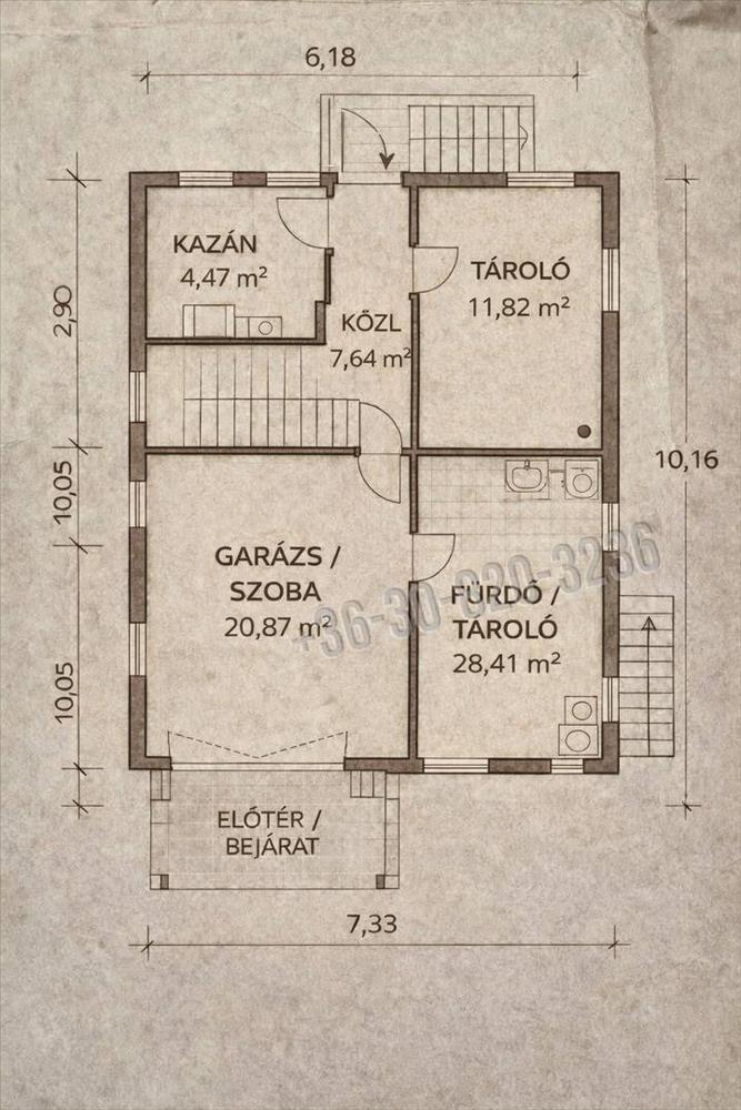 Alagsor: külön lakószoba, fürdőszoba, kazánház, tároló