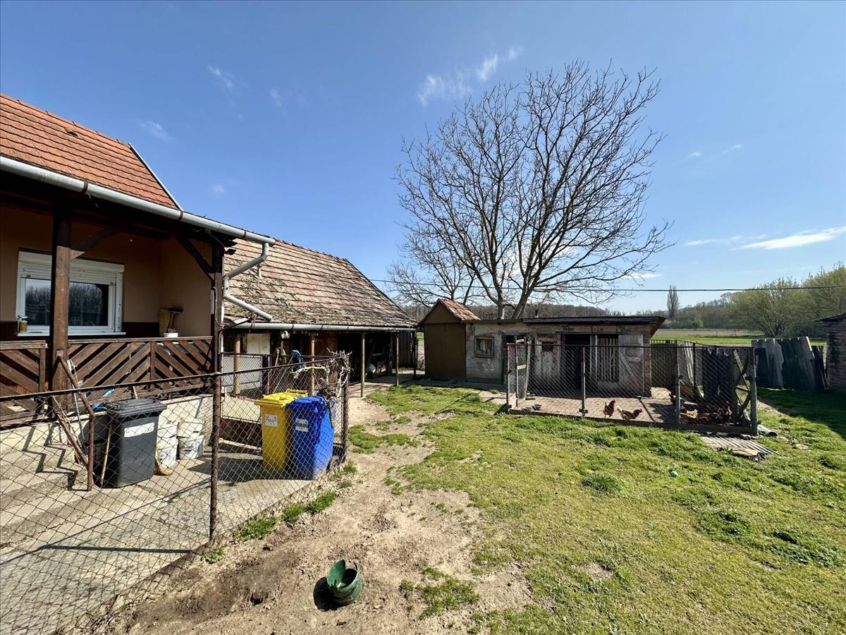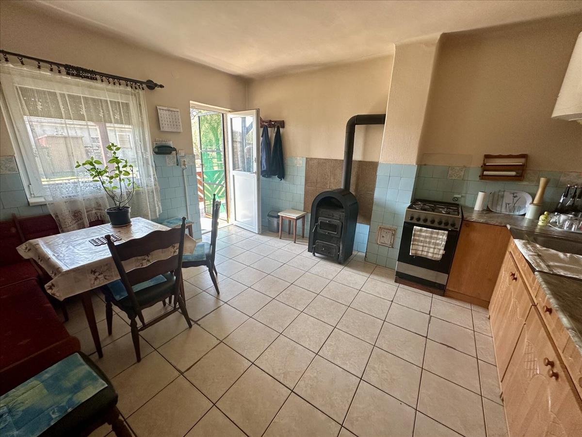 The property has brick walls, 2. 5 Bedrooms, and is situated on a plot of 2766 m2 with several outbuildings and a garage. It is mainly recommended for people who wish to buy a home of classic construction, in good condition, which they can modernise and furnish over time according to their taste and preferences. The land is also ideal for farming and livestock. Almost all the windows and doors have been replaced with insulated versions and the front door is in the process of being replaced. The roof structure and covering have also been completely renovated. The house is also provided with an external insulation, which is tinted with felt plaster. The property is heated by a tiled stove and a fireplace, and hot water is supplied by an electric boiler. The gas is piped to the street. There are currently two bedrooms in the first part of the house, but with a little conversion there could be up to three bedrooms. The bathroom has been renovated once, so both the water and sewage pipes have been replaced. The electrical wiring in part of the house has been replaced. The kitchen and the pantry are separate and can be accessed from the terrace. The terrace can be built in if required, so that all rooms can be accessed via a corridor. There is also a cellar under the kitchen. The plot is very wide, so there are plenty of possibilities for extra construction, a flower garden, an orchard, a workshop, or whatever you want.