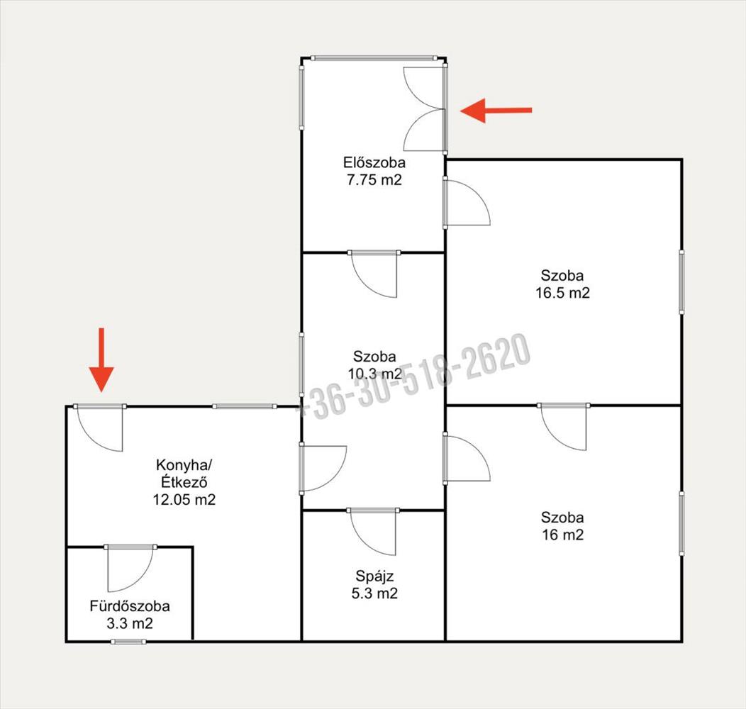 A belső elrendezés jól átgondolt: három tágas szoba, előszoba, spájz, konyha-étkező és fürdőszoba