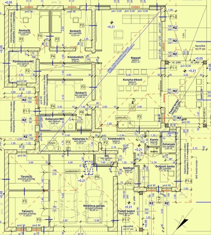 (kétállásos garázs 36, 66 m2, tároló 11, 99 m2, tároló 11, 99 m2) + fedett bejáró 7, 45 m2, fedett terasz 22, 29 m2