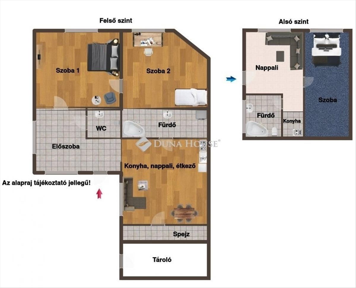 Alsó szintjén nappali, szoba, konyha-étkezővel valamint fürdőszoba található.