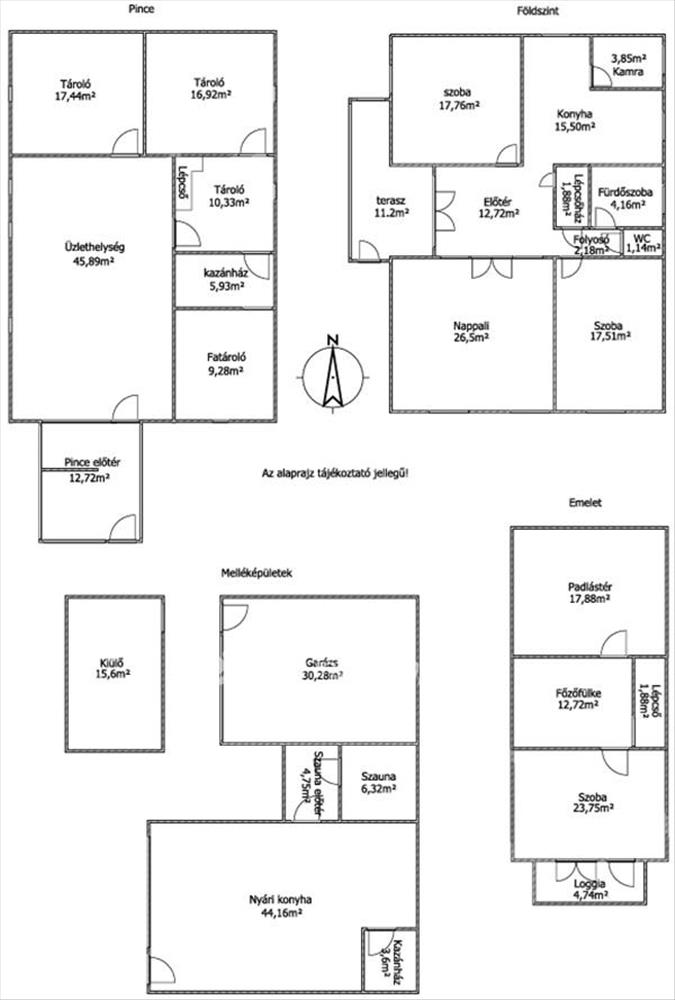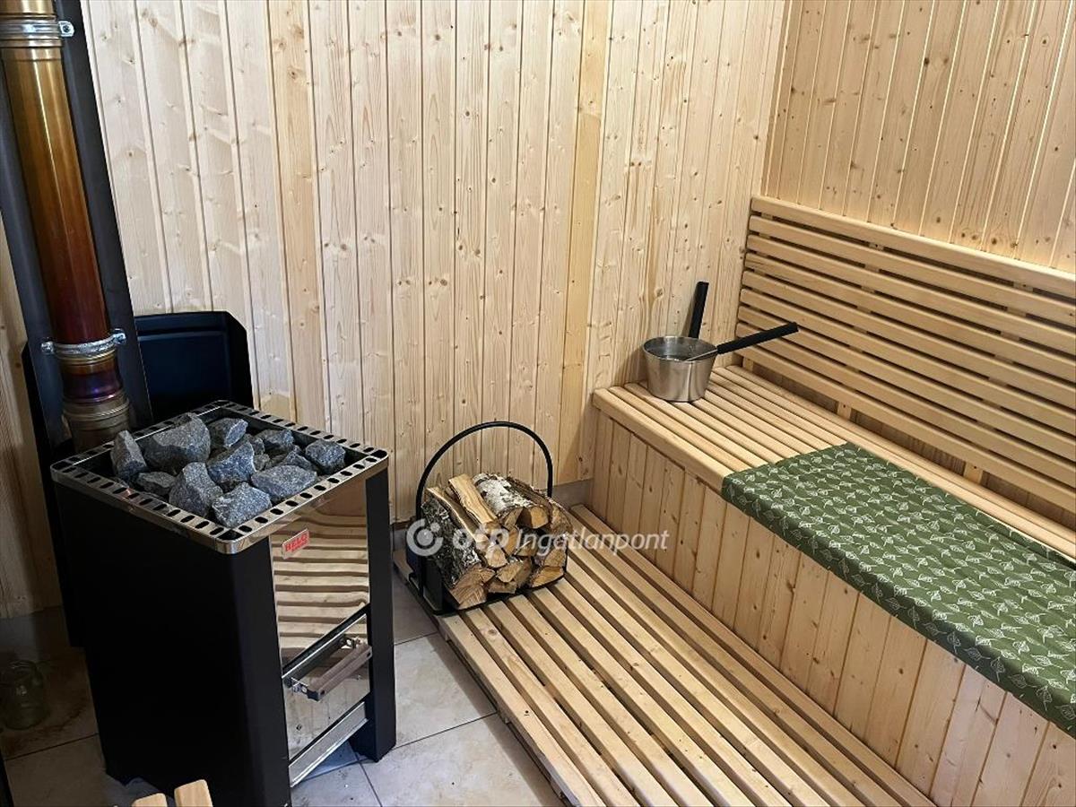 Az épület folytatásában több melléképület is helyet kapott. Található egy tágas, 44nm -es nyárikonyha, ahol jakuzzi került kialakításra, innen közelíthető meg a kazánház és a szauna is. a telken egy 30nm -es garázs található, amelyben akár két autó is elfér, valamint egy 15nm -es fedett kiülő is rendelkezésre áll. a telek rendezett, kellemes környezetet biztosít pihenésre és családi összejövetelekre.