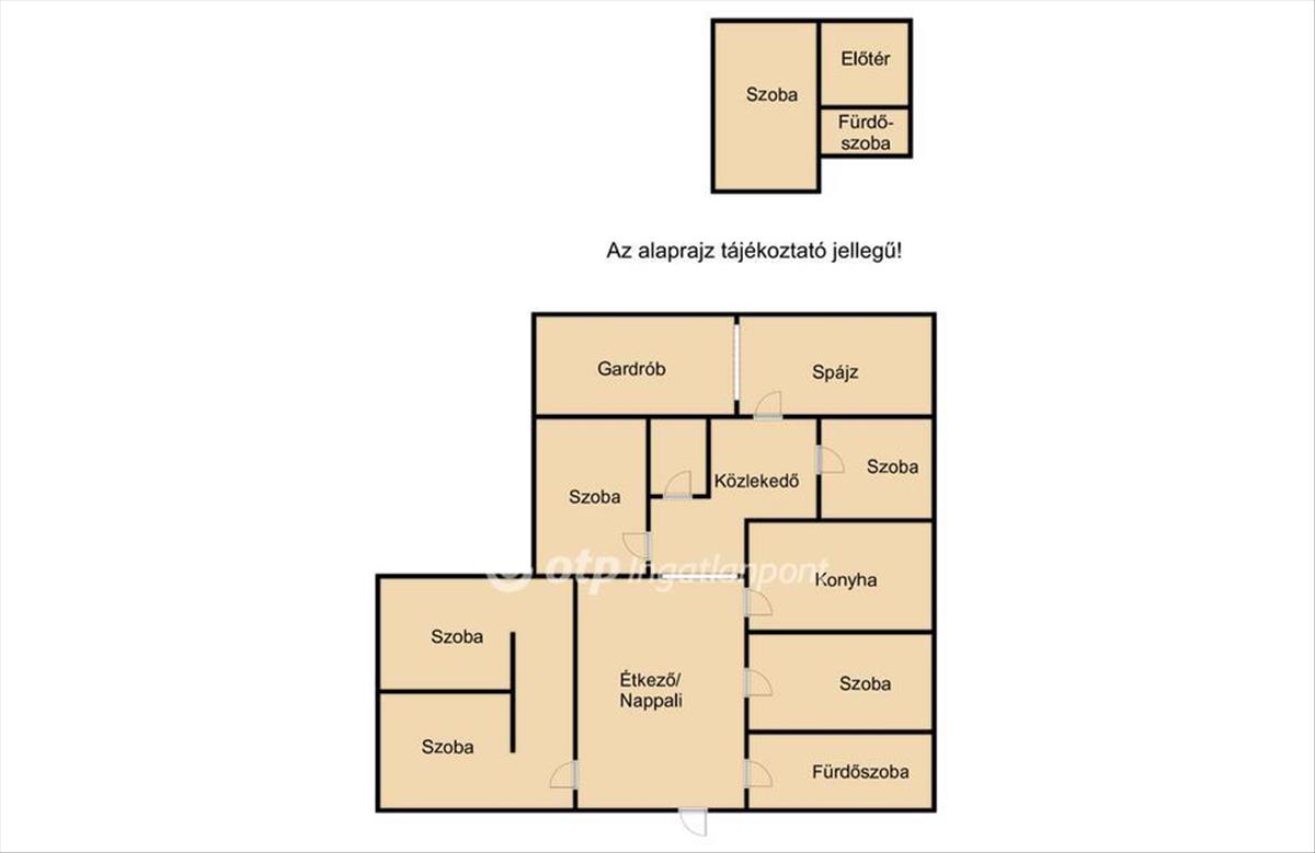 Az épületbe egy nagy teraszon jutunk be, ahol található egy hatalmas nappali-étekző, konyha, fürdőszoba WC-vel egy helyiségben, közlekedő, 5 külön nyíló hálószoba, WC.