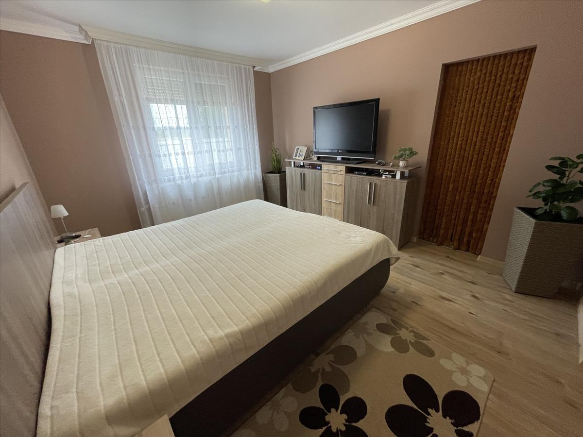 Nyírszőlős csendes, zöldövezeti részén, zsákutcában kínálunk eladásra egy 1999-ben épült, 89 m²-es, teljes körűen felújított, azonnal költözhető családi házat. Az ingatlan jelenlegi elosztása két különnyíló, tágas szobát és egy világos, amerikai konyhás nappalit kínál, azonban kis ráfordítással könnyedén háromszobássá alakítható. a fűtésről korszerű gázüzemű kondenzációs kazán gondoskodik, amely vegyes tüzelésű kazánnal is kiegészül, padlófűtéssel és radiátorokkal. a ház kiváló hőszigeteléssel rendelkezik (10 cm), műanyag nyílászárói redőnnyel és szúnyoghálóval szereltek, a nyári komfortot klíma biztosítja. a konyha egyedi tervezésű beépített bútorral és gépesítéssel kerül átadásra. Az udvarban kétállásos garázs elektromos kapuval, különálló kazánház és tároló is helyet kapott. a telek 3605 m², hátsó részén gondozott gyümölcsfákkal (három sor szilvafa), az utcafronti kapu szintén elektromos, távolról, Wi-Fi alkalmazással vezérelhető külső világítással felszerelve.