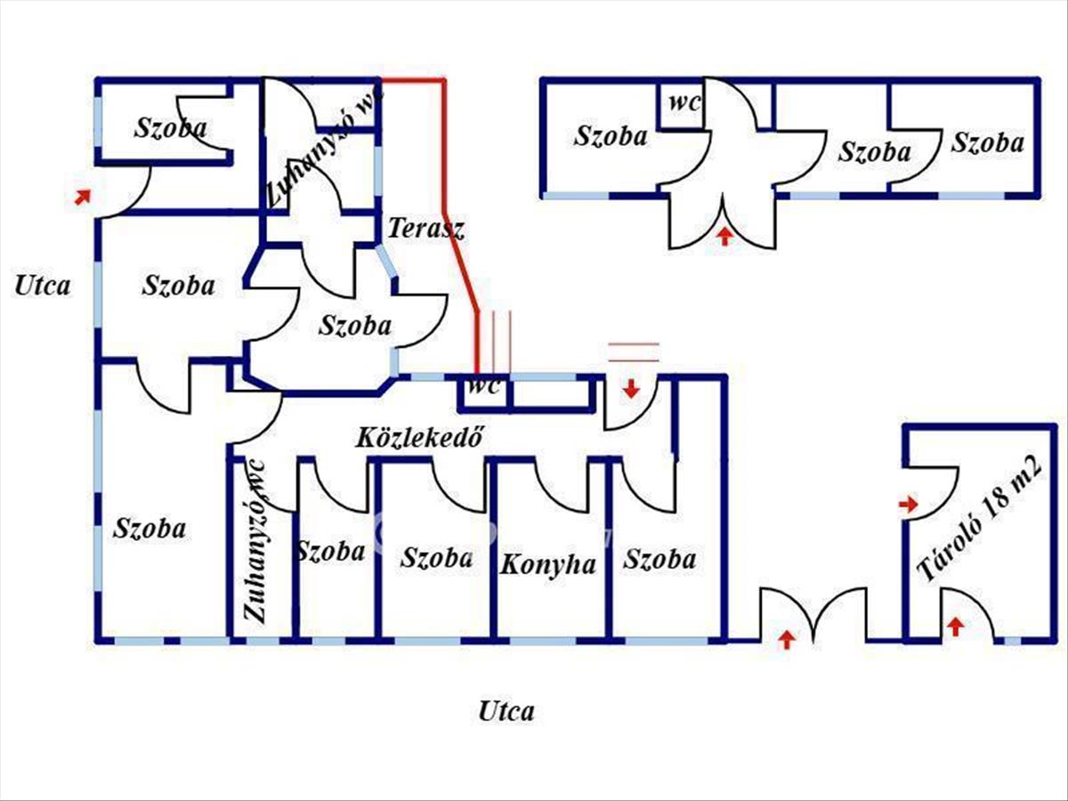 A telken 3 épület van ( lakóház, melléképület, tároló) az udvarban 8 személyautó tud parkolni. Az építmények összesen 480 mn-es nagyságúak. a főépület/lakóház (387 mn), alápincézet (pince: 84 mn), melléképület 75, 5 mn-es, a tároló (18 mn-es). 2 Generációs használatu is lehet, akár iroda, 7 szoba, 4 wc, 2 zuhanyzó. Az ingatlan 3 utcafronti bejárattal rendelkezik, az udvarból is van bejárat.