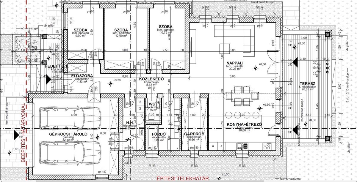 Építés éve: 2025, lapos fedésű (Porotherm X-therm 30-as okos téglából épült, 15 cm homlokzati + 50 cm födémszigetelés).