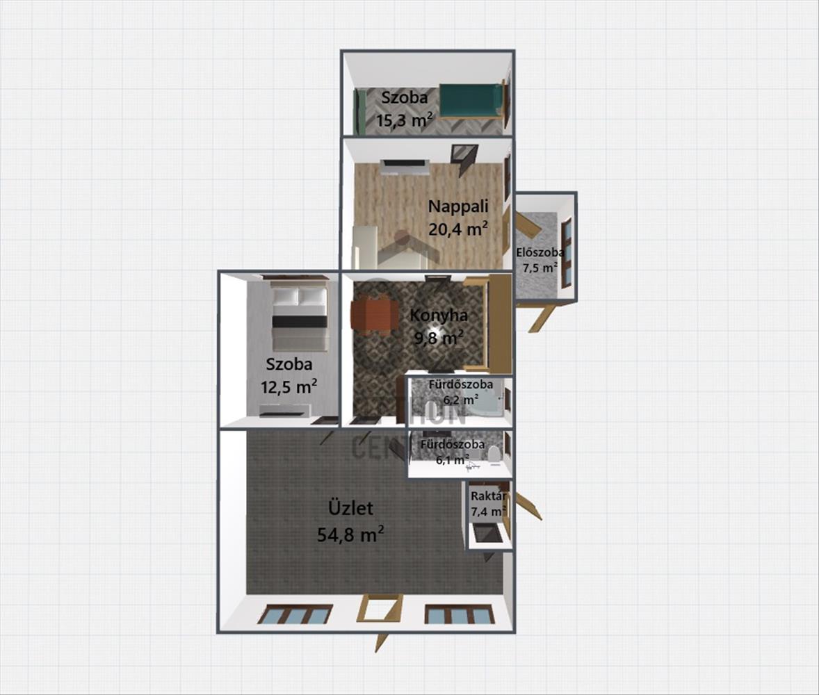 A ház egyik része teljes értékű nagy üzlethelyiségként funkcionál — ideális fodrászatnak, irodának, szolgáltatásnak, rendelőnek vagy bármilyen vállalkozásnak, amelynél fontos a könnyű megközelíthetőség és a külön bejárat.