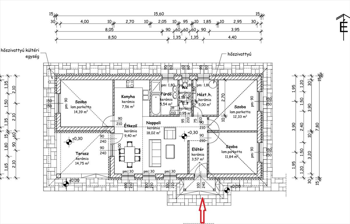 A hőszivattyús padlófűtésre tervezett ház villany, víz és csatorna közművekkel ellátott.