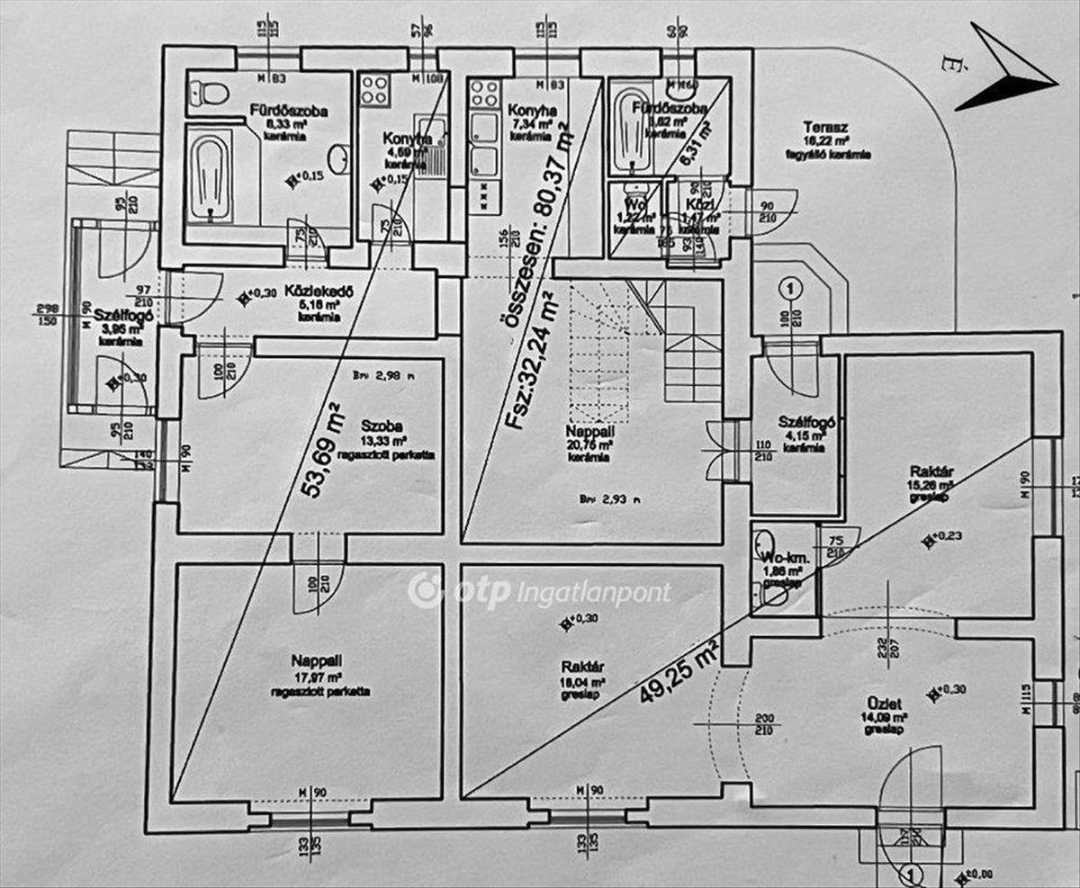 -Utcafronti üzlethelyiség: 3db szoba (raktárak + üzlethelyiség), WC
