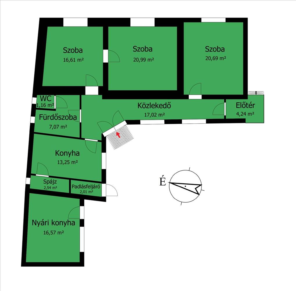 A ház három szobával és egy konyhával rendelkezik, és az elrendezésének köszönhetően akár kétgenerációs otthonná is alakítható.