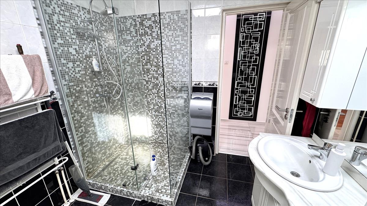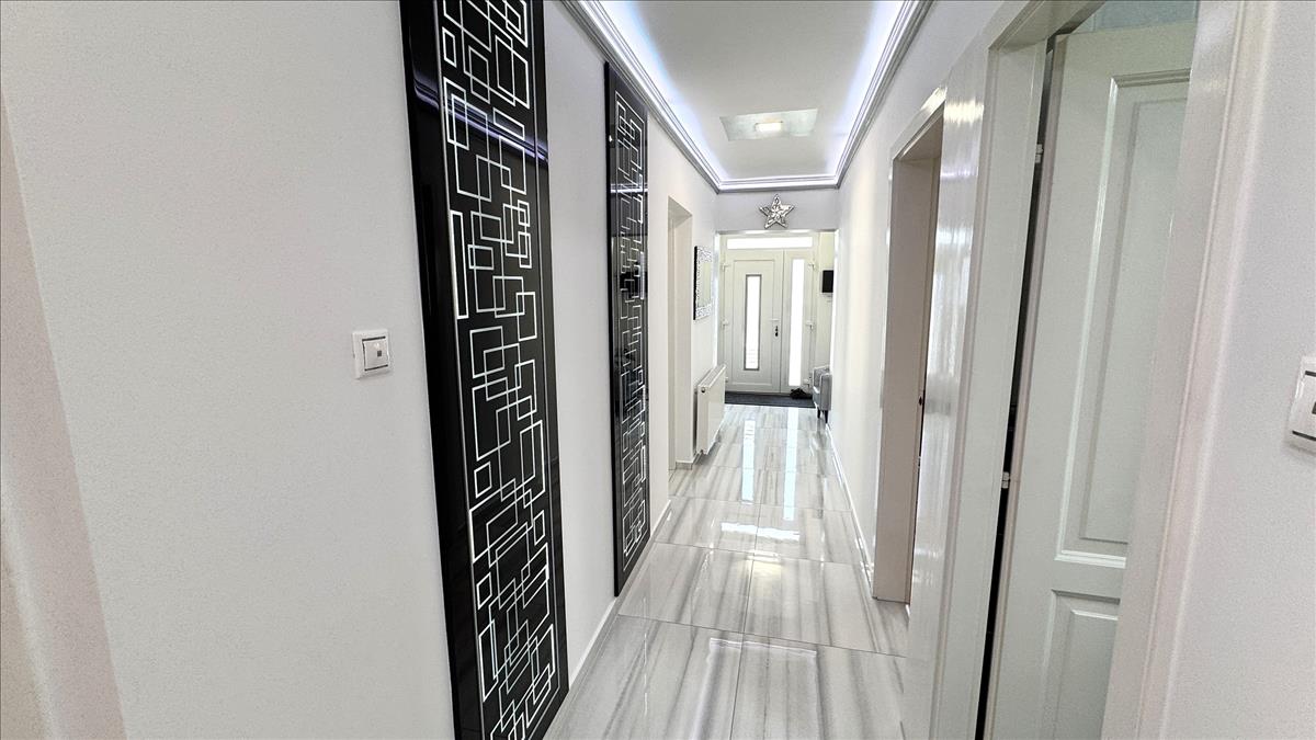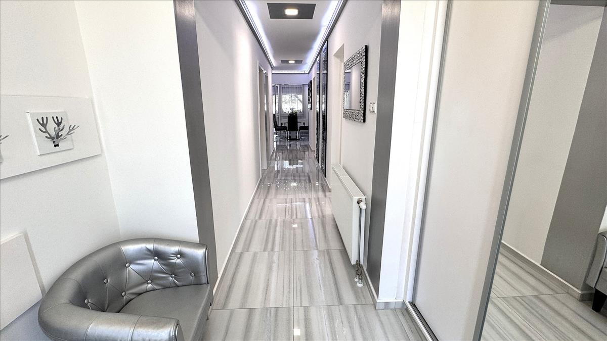 Közlekedő: 3 külön nyíló hálószoba, tágas amerikai konyhás nappali, 35 nm -es teraszkapcsolattal, kamra, kádas-zuhanyzós-dupla mosdós fürdőszoba, külön wc.
