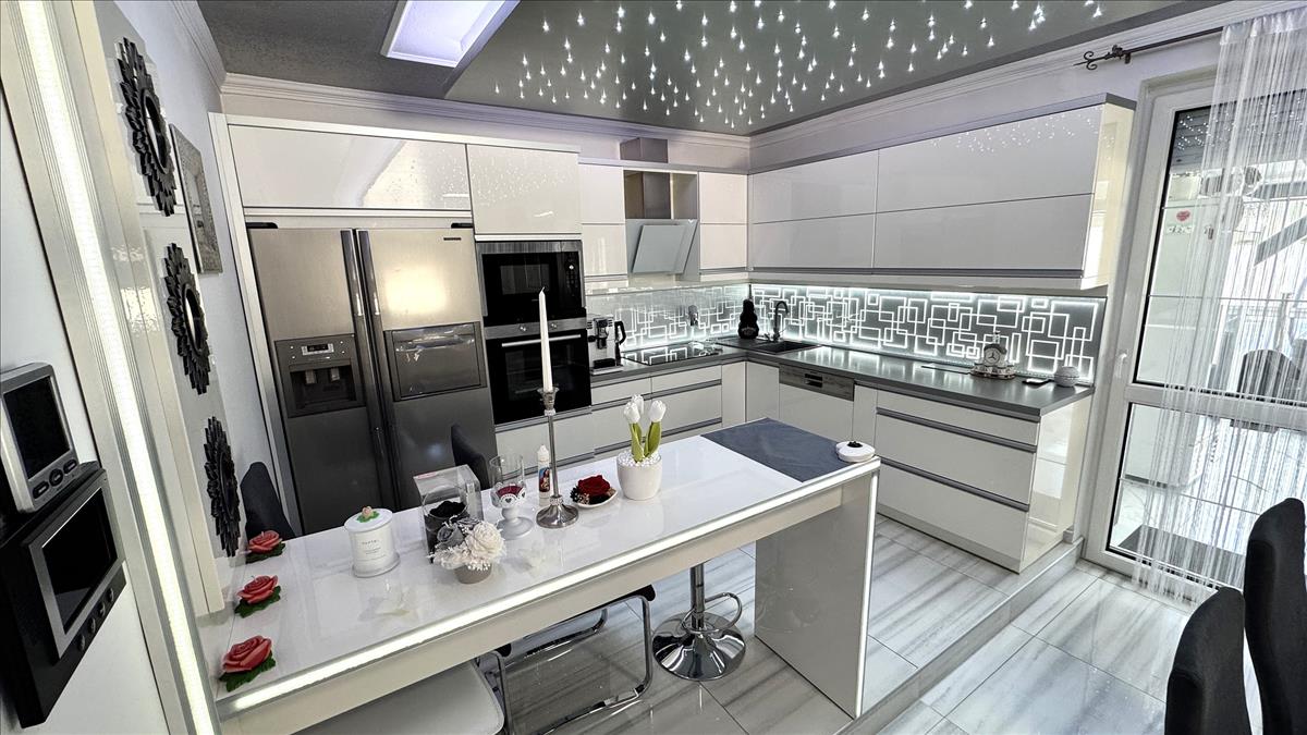 Riasztó, kamera rendszer, automata garázskapu, automata kapu, elektromos autó töltő, led fényforrások, öntözőrendszer, beépített, gépesített konyha.