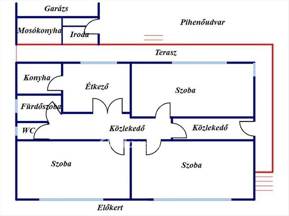 A lakótér praktikus és élhető elrendezésű: három különnyíló hálószoba, konyha, külön étkező, kamra, fürdőszoba zuhanyzóval és sarokkáddal is felszerelt, a wc külön helyiségben kapott helyet, körbefutó terasz ideális helyszín a pihenésre, a ház alatt pedig egy kisebb pince is rendelkezésre áll.