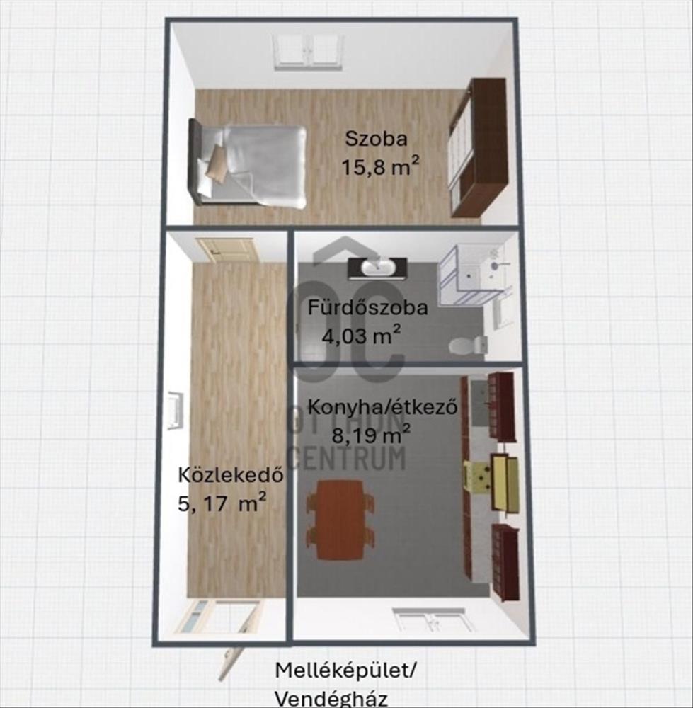 A telken található melléképület vendégházként, külön lakrészként, vagy akár vállalkozási célra is kiválóan használható. Itt konyha-étkező, fürdőszoba és hálószoba várja az új tulajdonosokat, hűtő-fűtő klímával és bojlerrel felszerelve.