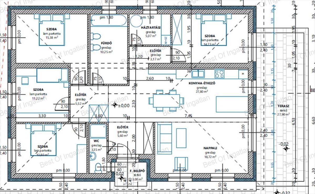 Az igényes családi ház belső elosztása a következő: a fedett belépőn keresztül jutunk az előtérbe, ahonnét jobbról a tágas amerikai konyha + étkezős nappaliba érkezünk. 4 Hálószoba (mindegyik élhető méretű, jól bútorozható) 2 fürdőszoba (egyik kádas, bidés, a másik zuhanyzós) szolgálja az új tulajdonosok kényelmét. A háztartási helyiségben található a gépészet, de nagysága miatt akár tárolási célt is szolgálhat.
