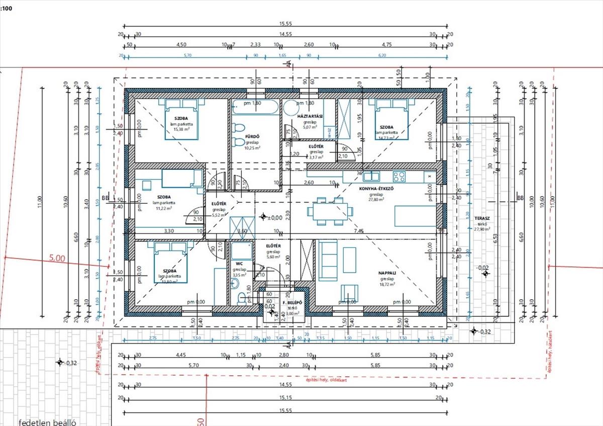 •4 külön nyíló hálószoba (11, 2 m² / 13, 8 m² / 14, 7 m² / 15, 4 m²)