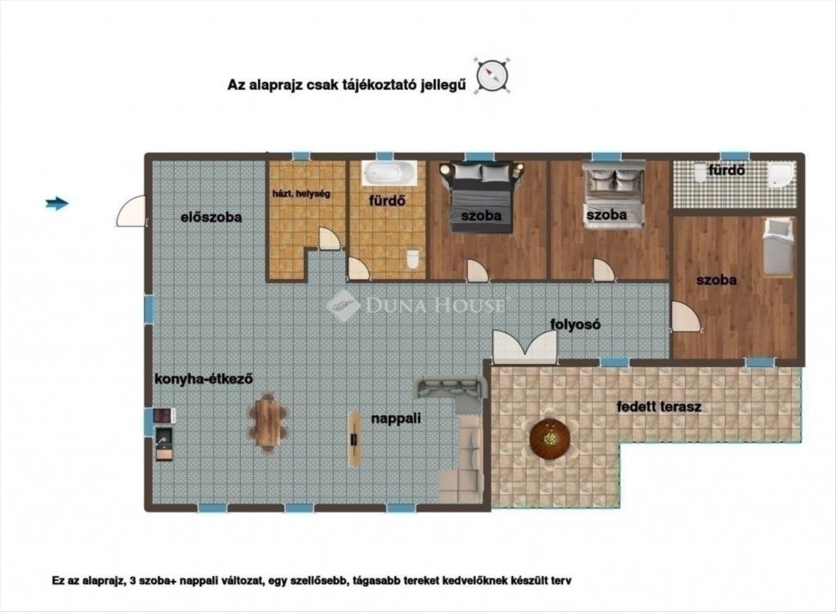 Aki a tágasabb tereket kedveli, annak készült egy 3 szoba + nappaliból álló terv is.
