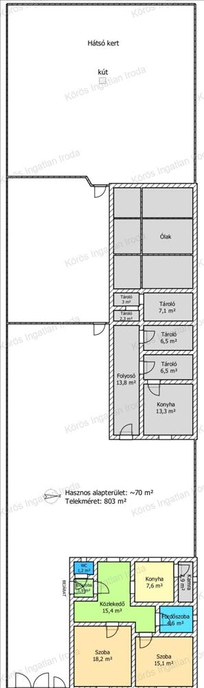 A telek nagysága 803nm, mely körbehatárolt, kis, -és nagykapuval ellátott.