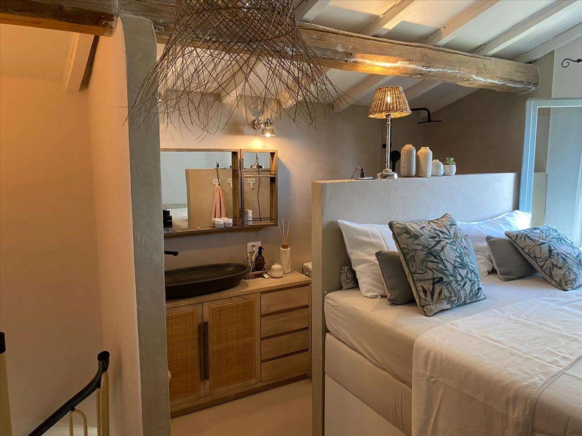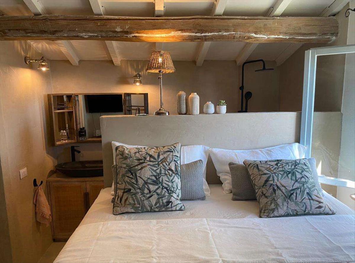 Egy gyönyörű spirálisan felkanyarodó lépcső vezet fel, ahol a hálószoba és a zuhanyzós fürdőszoba található.
