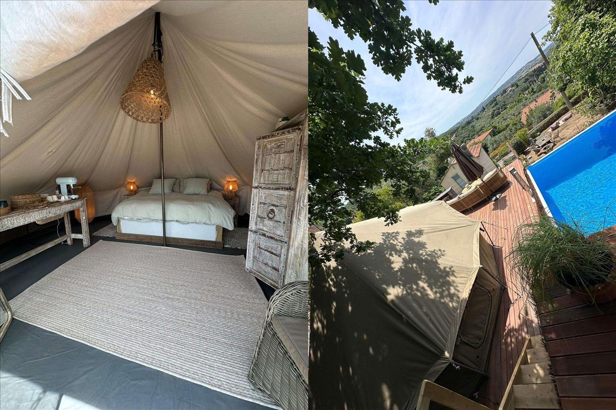 A teraszról elérhető a hátsó kert és egy másik fa terület, ahol van még egy hálószoba egy sátorban és egy fürdőszoba.