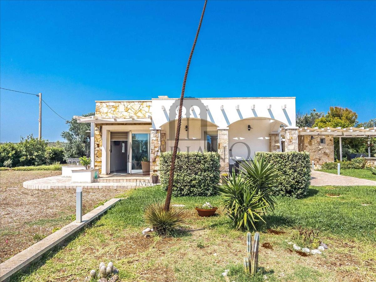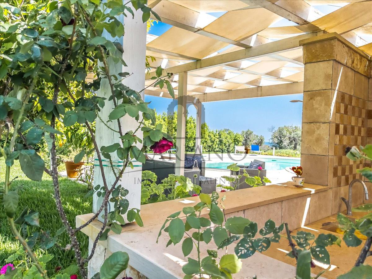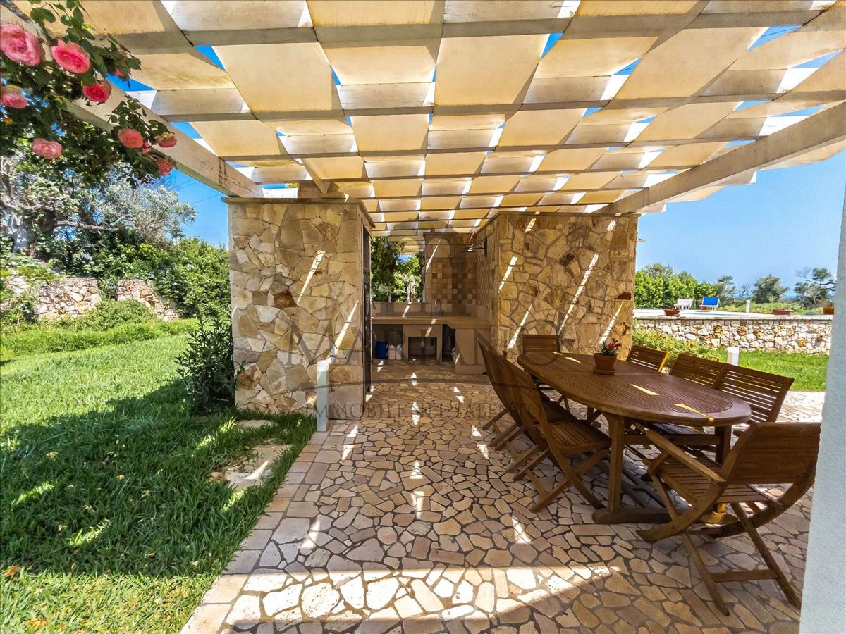 Külső részen a homlokzat szinte teljes hosszában portikus található, amelyen nyugodtan pihenhetsz, és szabadban étkezhetsz vagy vacsorázhatsz. Az ingatlan mintegy 4000 m²-es területe teljesen kerített, örökzöld sövényekkel körülvéve. A külső terület részben kertként, olajfákkal és jellegzetes helyi növényzettel, valamint gyönyörű dísztóval, részben pedig relaxációs zónaként szolgál.