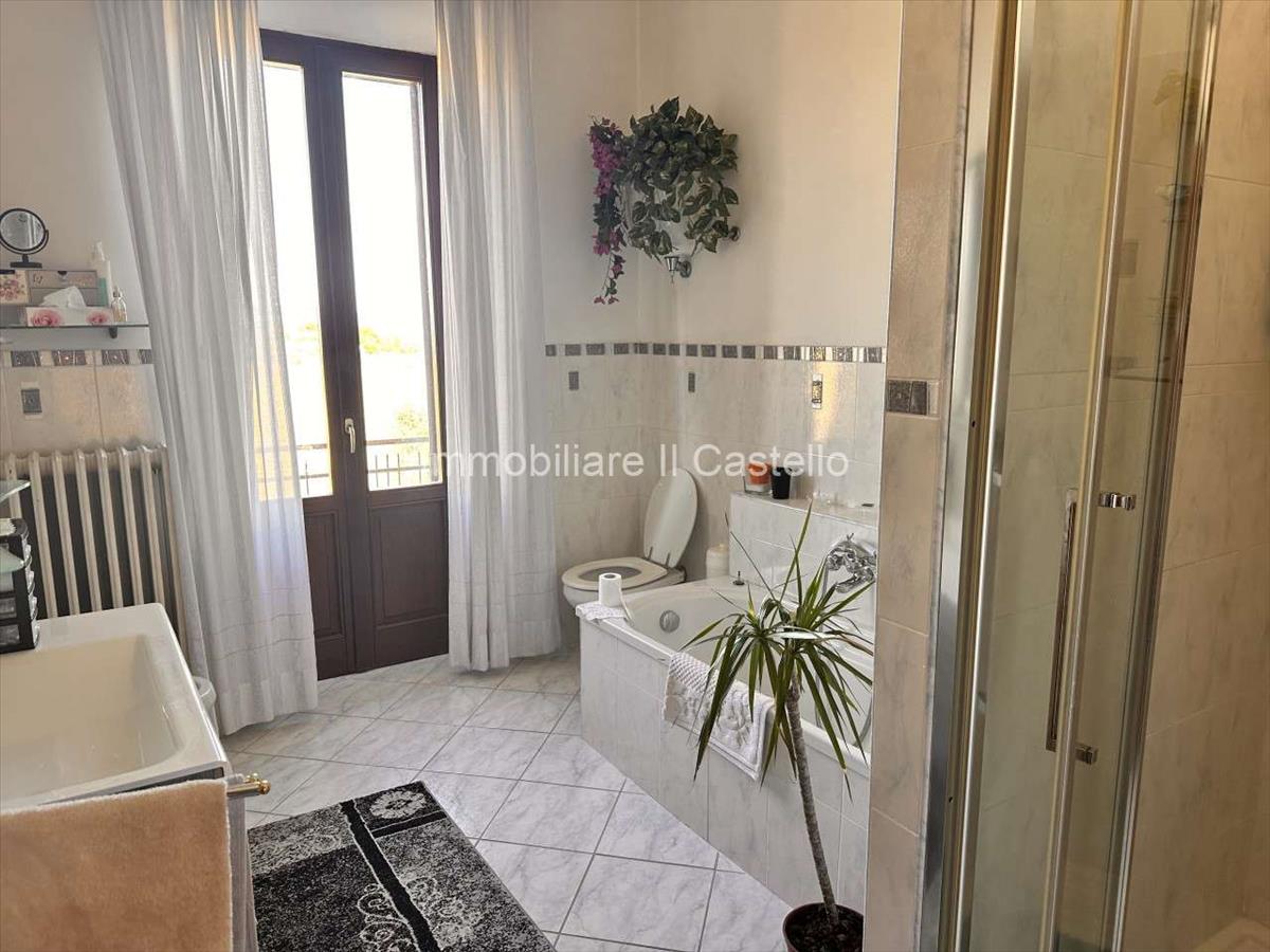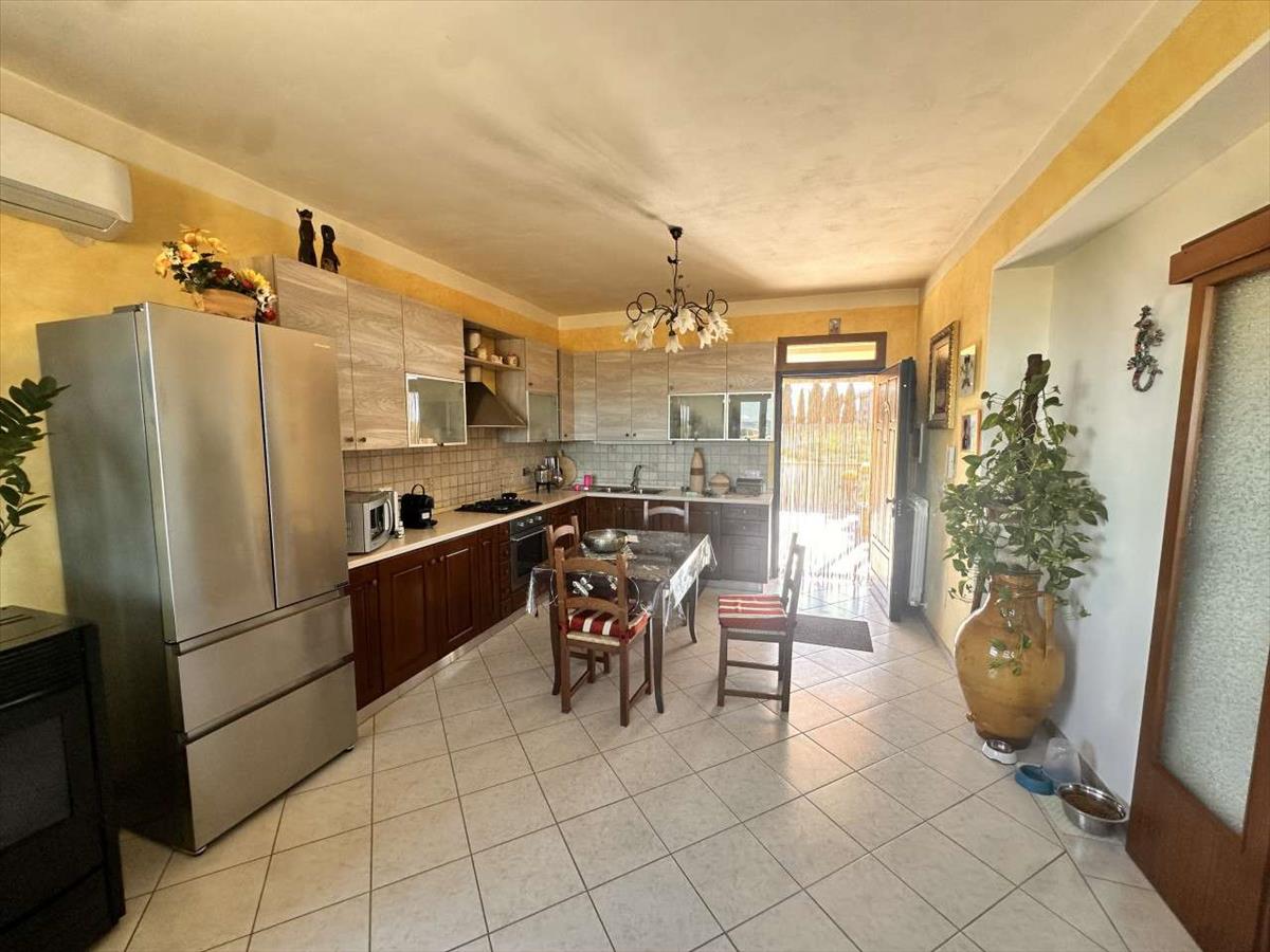 Az első emeleten belső lépcsőházon keresztül megközelíthető egy nappali, a konyhában pellet tűzhely és légkondicionáló, két kétágyas hálószoba, egy terasszal, két fürdőszoba, és egy körülbelül 40 m²-es fedett terasz, csodálatos kilátással a Trasimeno-tóra és a környező vidékre.
