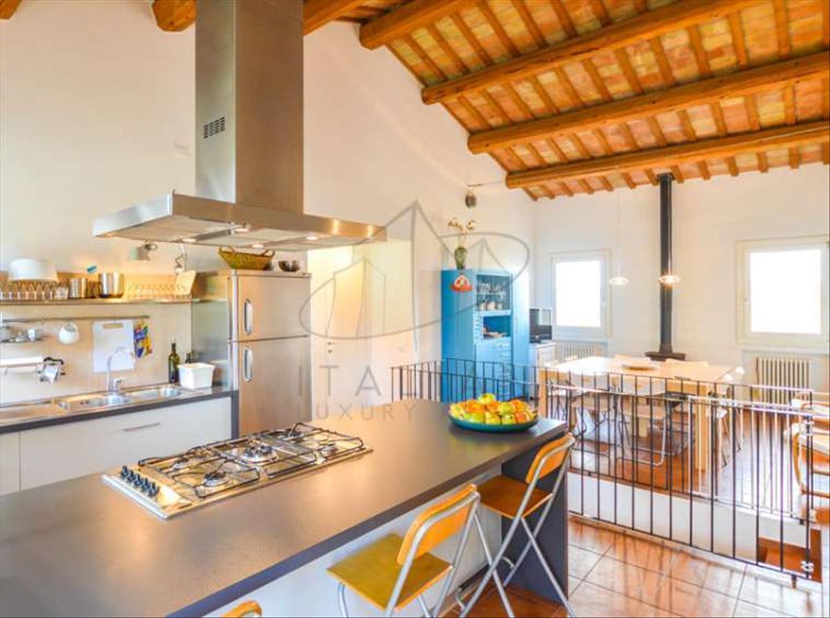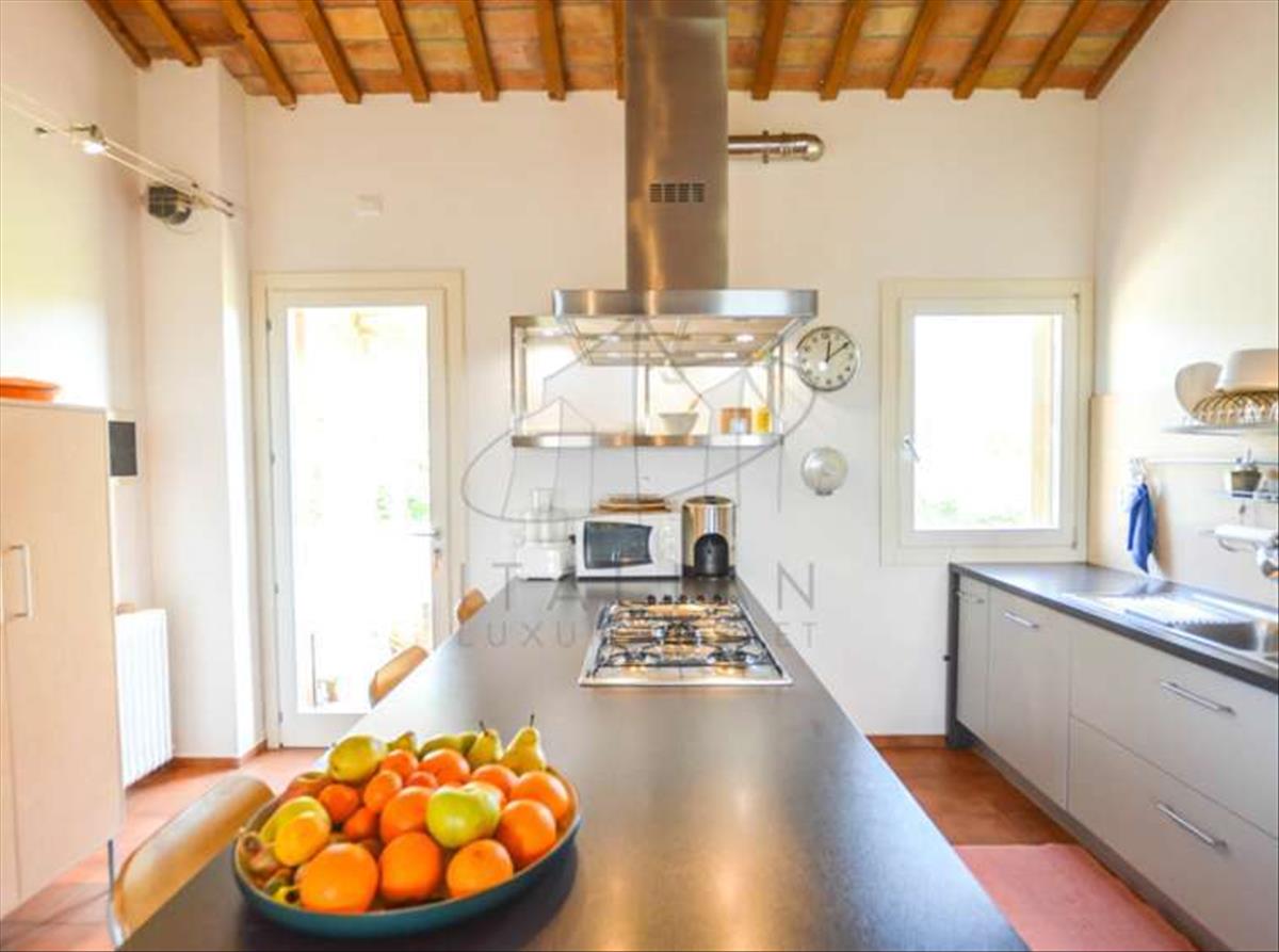 Amikor a természetben lévő parasztházra gondolunk, amelyet hemzsegő dombok és különböző fafajok vesznek körül, egy érintetlen helyen, akkor valami ilyesmit képzelünk el. Ez a parasztház a régió Marche egyik legfestőibb helyén található, a körülötte gördülő dombok és olajfaligetek között. 2002-ben teljesen újjáépült a semmiből nyaralóhellyé, ez a hagyományos parasztház pedig egyedülálló élményt nyújt a vendégeknek. A ház homlokzata eredeti téglákból és gipszből áll. Az épület teljes alapterülete 350 m2. Több mint 3 emelet áll a rendelkezésre, összesen 7 hálószoba és 6 fürdőszoba.Földszint: A földszinten számos francia ablak adja a lehetőséget, hogy a kertbe jusson a ház minden szobájából. A nappali két nagy, világos részből áll, amelyeket három négyzetes ív köt össze. Ezt a teret a három kis ablak tükrözi, mindezt tökéletes geometriában. Három lépés vezet egy folyosóhoz, amely összeköti a három tágas kétágyas hálószobát, mindegyikhez saját fürdőszoba tartozik. Ugyanazon az emeleten található még egy vendégfürdőszoba és egy hasznos mosókonyha. Ez az emelet elsősorban a vendégek szálláshelye; a hálószobák itt találhatók, míg a nappali reggeliző- és ülőhelyet kínál.