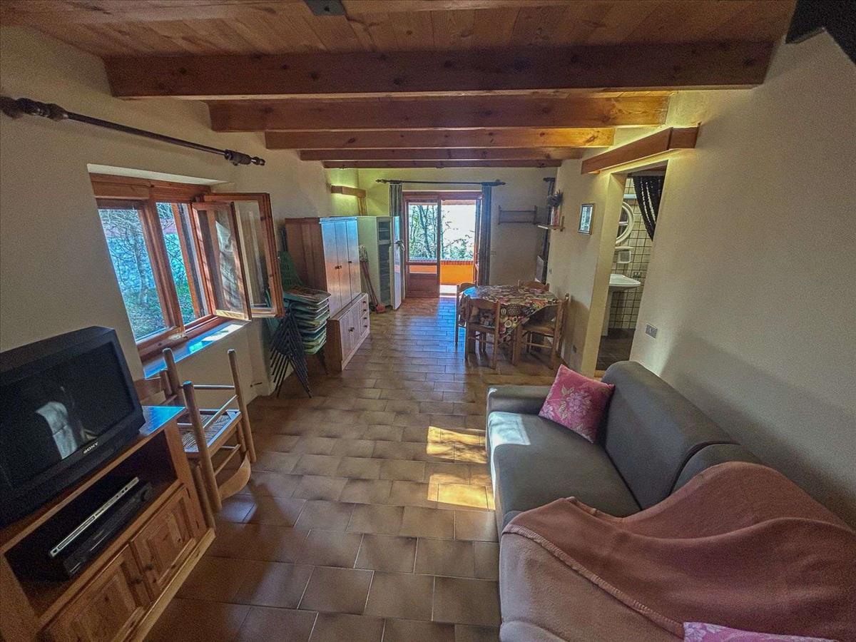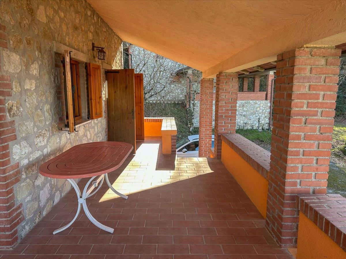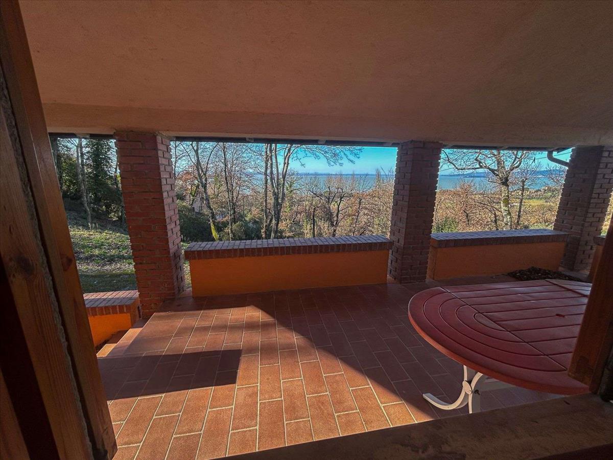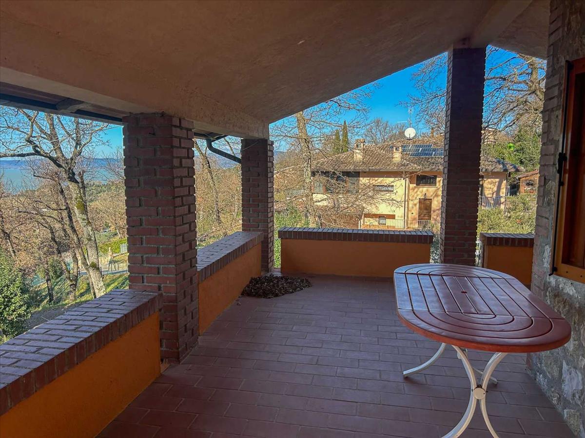 Dombos helyen, nyitott kilátással a Trasimeno-tóra és a naplementére, kő- és tégla építésű, önálló ház kb. 140 m²-es, három szintes. Az alsó emeleten garázs és két nagy szoba található, melyeket tárolóként használnak.