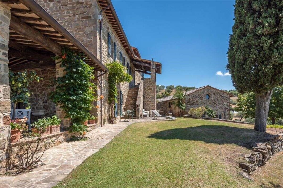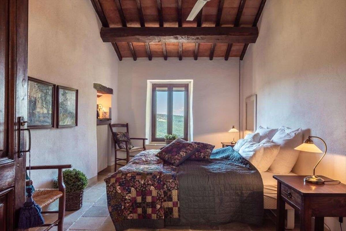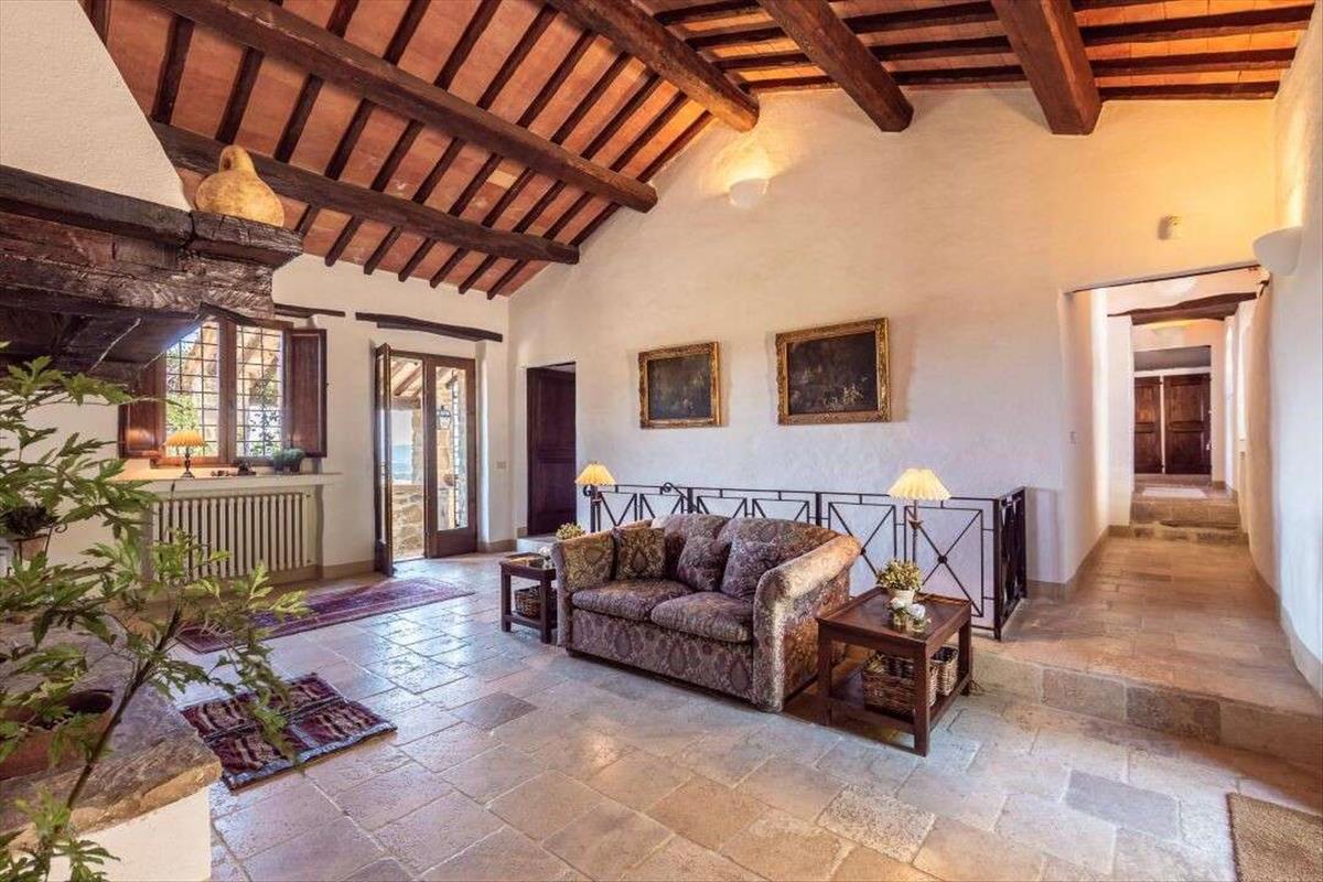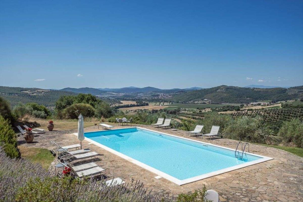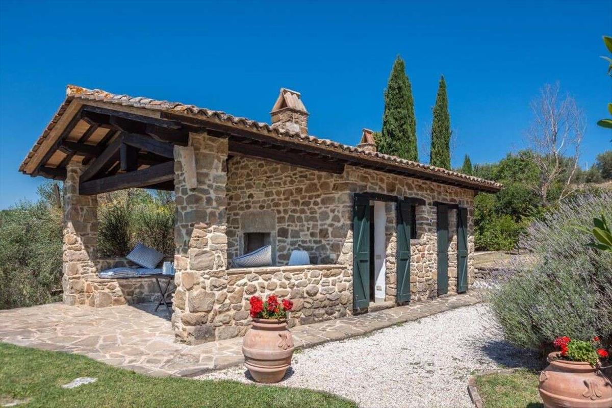 Időtlen Umbria-i birtok panorámás kilátással és elegáns kővillákkal, vendégház és medence eladó Lisciano Niccone-ban. Buja, gördülő dombok között Umbria közelében a Trasimeno-tó Természeti Parkjához ez az elegáns vidéki birtok ritka keveréket kínál a történelmi karakter és a kifinomult modern élet között.A 2,5 hektáros (62 hektáros) földterületű telken két tökéletesen felújított egykori parasztház áll, amelyek hagyományos kőhomlokzatúak és panorámás kilátással bírnak, amely az umbriai vidék lényegét idézi. Az egyik alapterülete 535 négyzetméter, három emeleten át, a másiké 440 négyzetméter, két szinten. Magas mennyezet, eredeti kandallók és kézzel készített befejezések jellemzik őket.