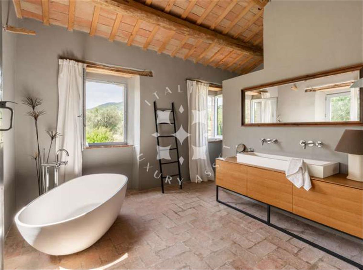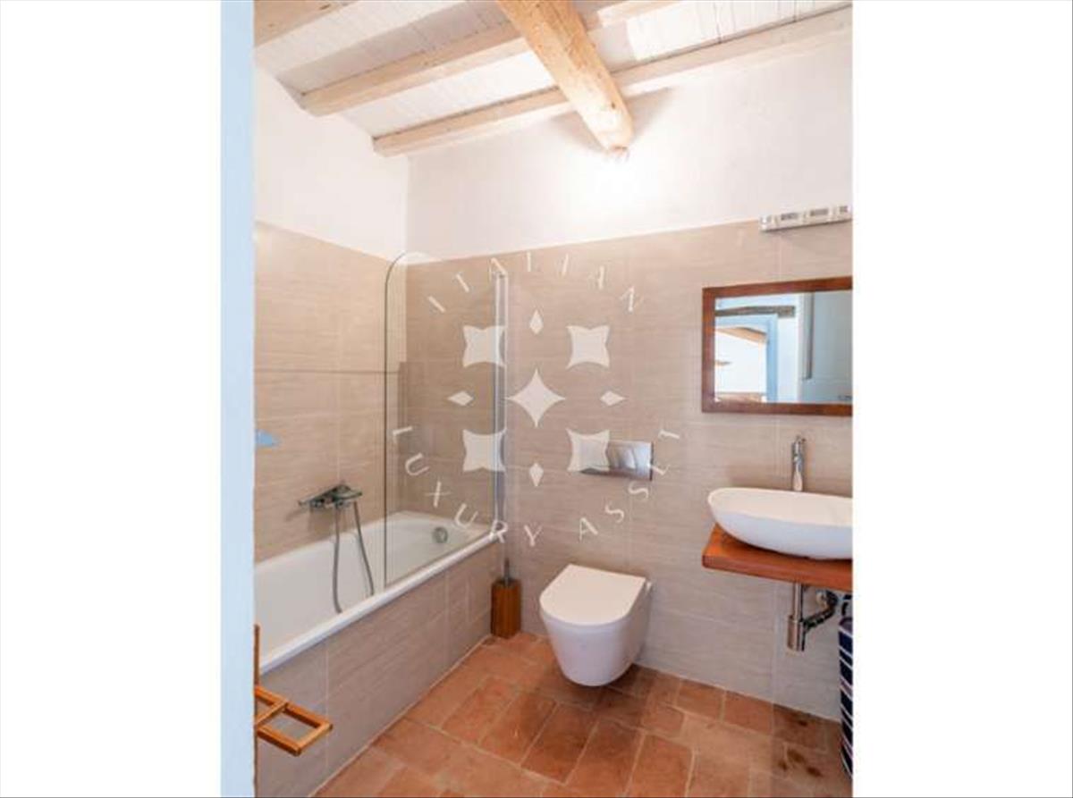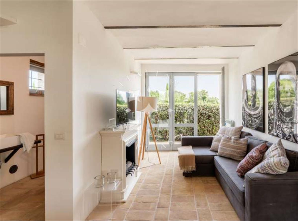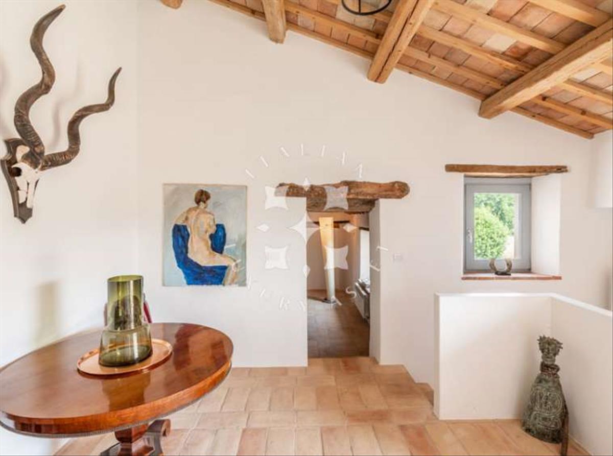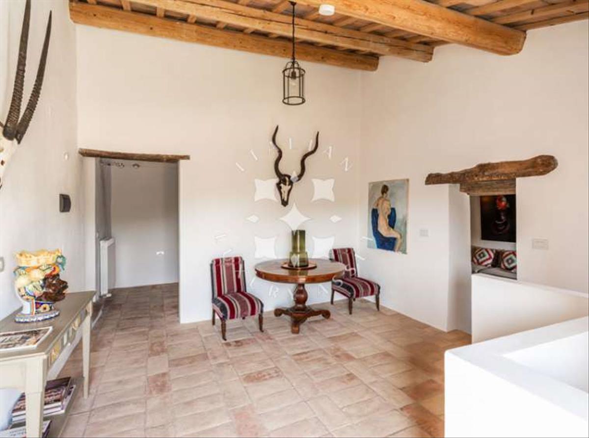 A főház körülbelül 487 m² alapterületű. Jelenleg két független apartman található, amelyeket később egyetlen otthonná kapcsolhatsz össze. A jelenlegi tulajdonosok 2014-ben teljesen felújították az ingatlant: világos építészeti koncepcióval megőrizték a ház történelmi vonzerejét, és gyönyörű modern részletekkel egészítették ki a helyi, hagyományos anyagokat, mint például a kézzel készített cotto csempéket és a mennyezeti gerendákat. Az épület központi része krémfehér, és a helyi kő két magasabb vége között helyezkedik el.