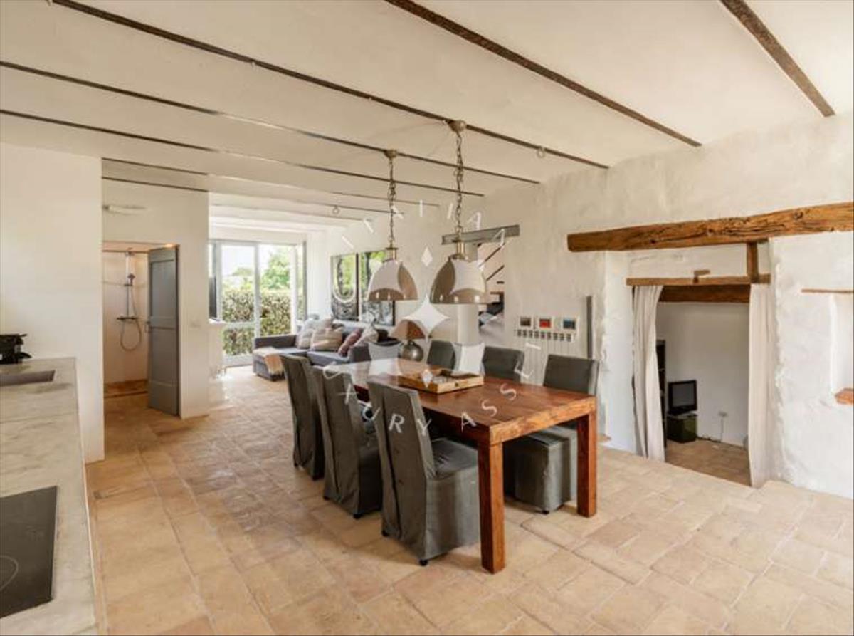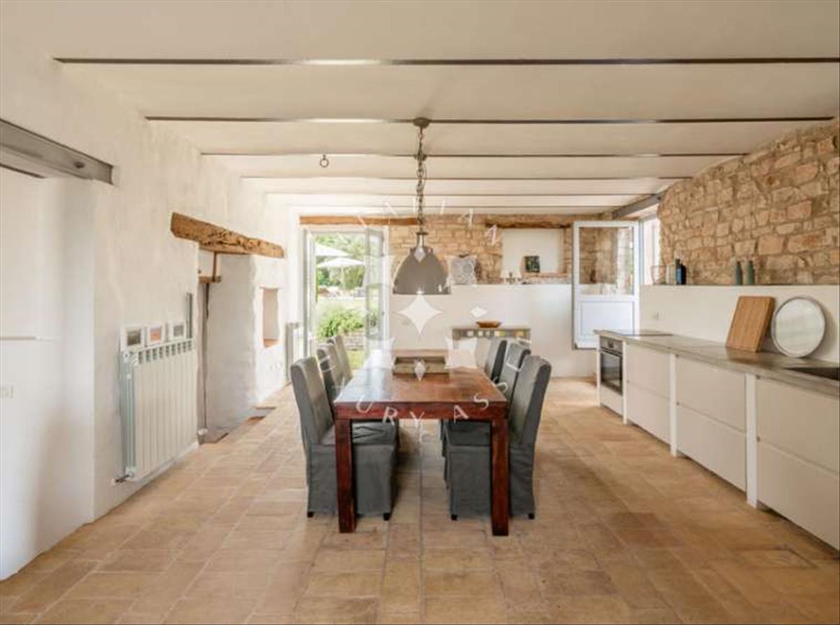 Földszint: Az eredeti istállók nyomán a főkonyha számos történelmi jellemzőt őriz, többek között a többi íves mennyezetet, vastag kőfalakat és téglalap alakú ablakokat. A rusztikus cotto padló és a kandalló kiegyensúlyozzák a központi részt, ahol egy modern, fehér konyhasziget dominál. Elég tágas ahhoz, hogy étkező és kényelmes ülő sarok legyen, és mindkét végén ajtók nyílnak a kertbe. A vendégszárnyban egy második, ülőterülettel ellátott konyha tükrözi ezt a kialakítást, ugyanolyan jól felszerelt és étkezőhellyel. Egy ajtó közvetlenül a teraszra nyílik, ideális al fresco étkezésekhez. Ezen az emeleten még található egy hálószoba, egy tévé-szoba, egy tároló és egy kényelmes mosókonyha.
