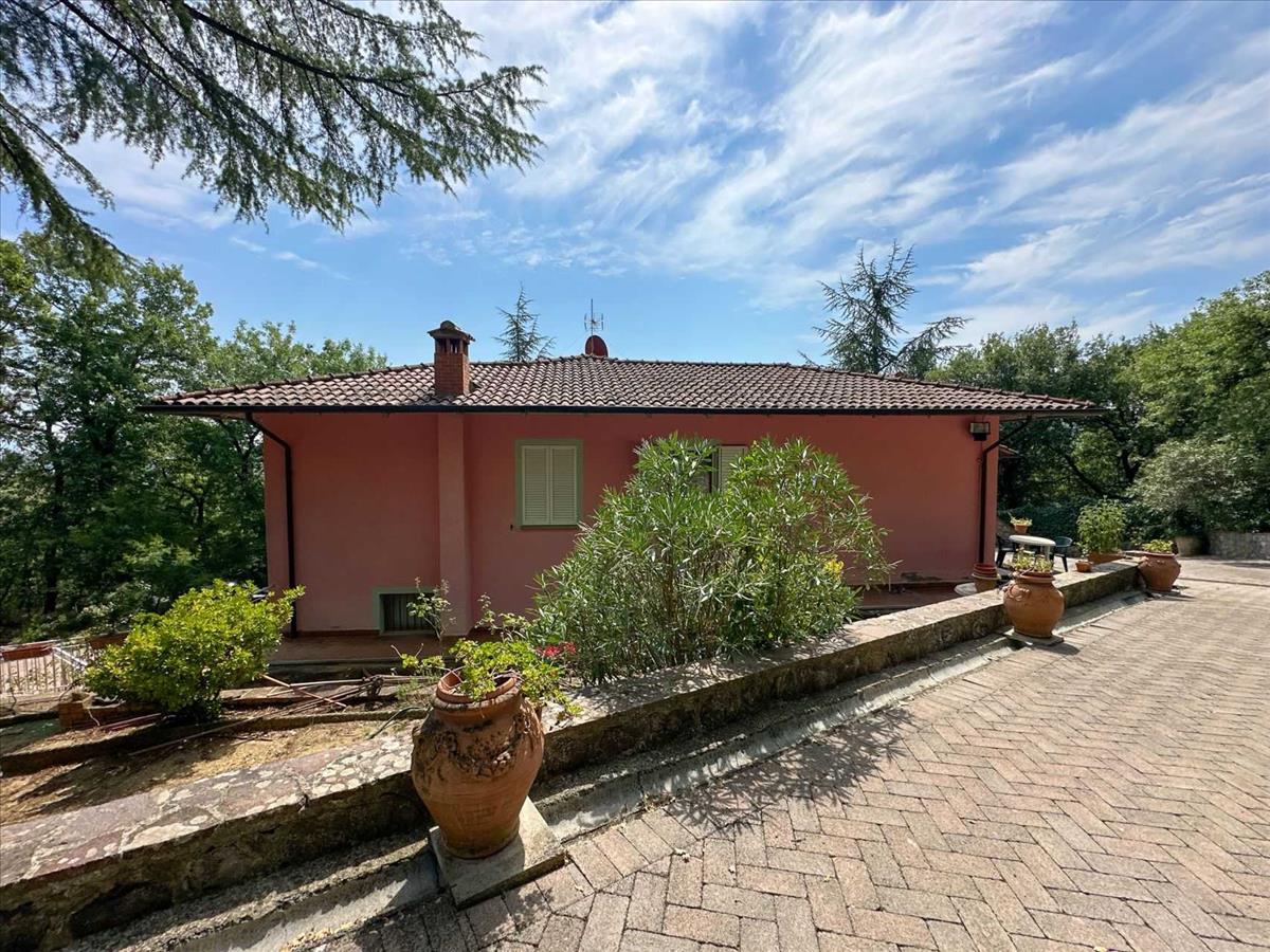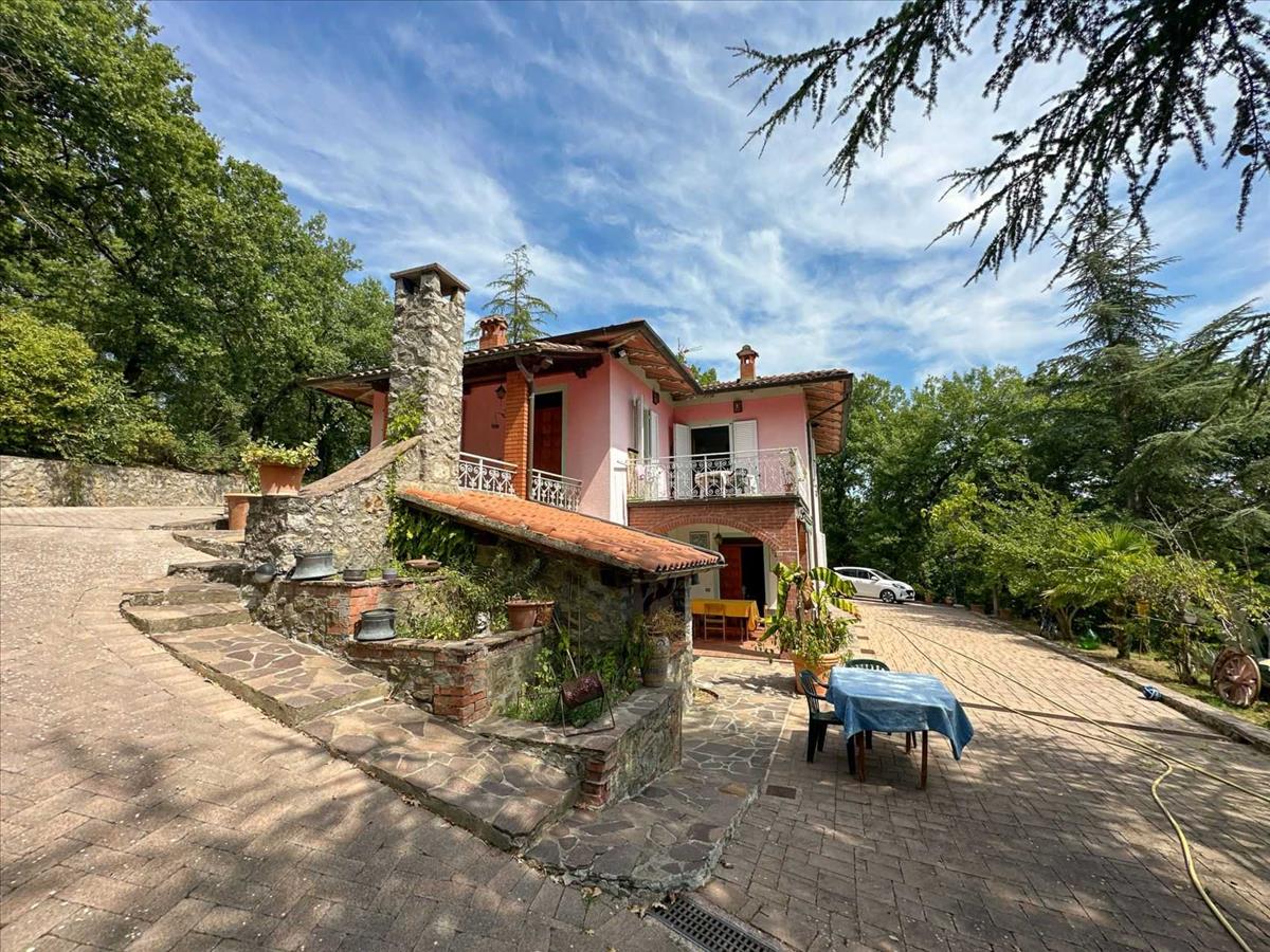 Gyönyörű villa egy dombos, panorámás területen, egy 5000 m²-es parkban, magas fákkal körülvéve, teljesen kerített. Két autópálya közelében található.A kb. 230 négyzetméteres villa a következőkből áll. Földszint: terasz, előszoba, étkező kandallóval és belső lépcsőházzal a felső emeletre; fürdőszoba, zuhanyzó, kamra és egy nagy pince, nyitott konyhával, amely egy gyönyörű kikövezett kültéri területre vezet.